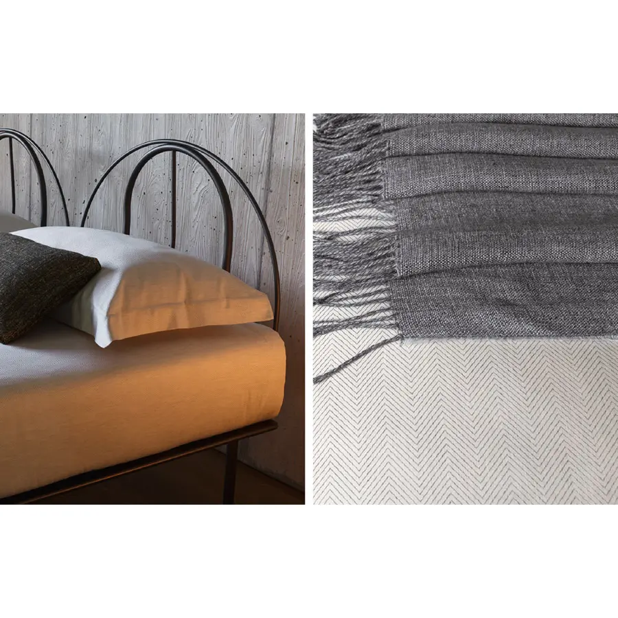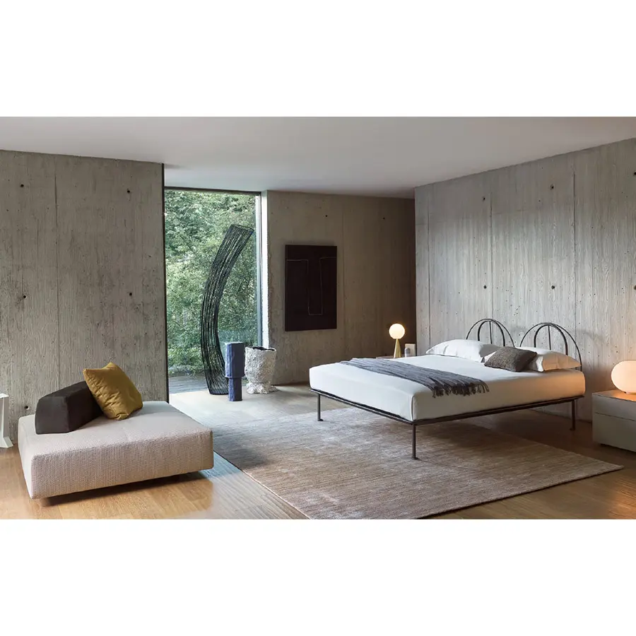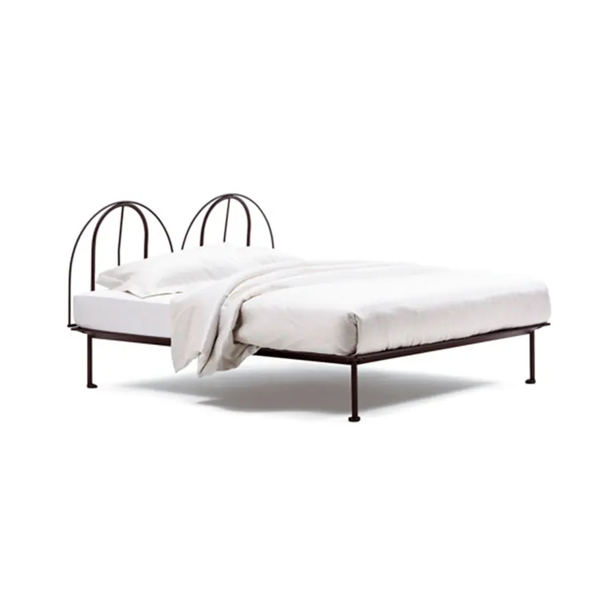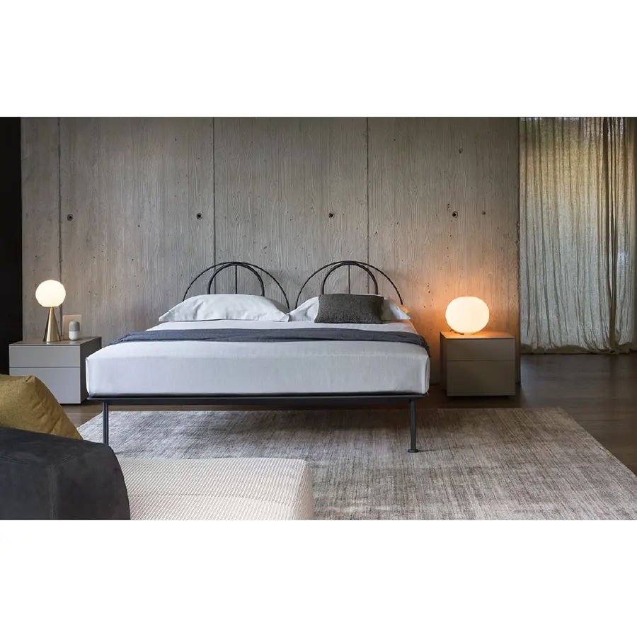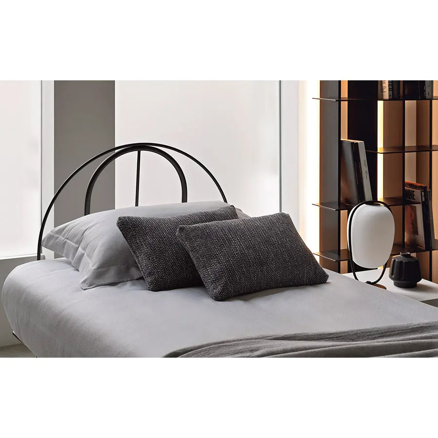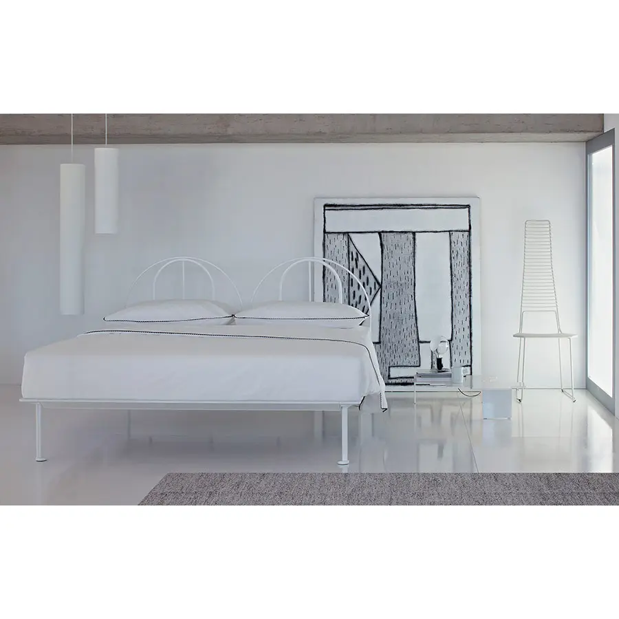 Cama de diseño moderno y actual con estructura de aluminio lacado gris y blanco. Cabecera semicircular que puede ser provista de revestimiento desenfundable. Plano de reposo de lamas ajustables.