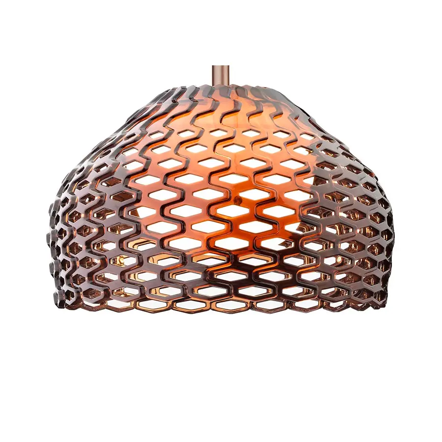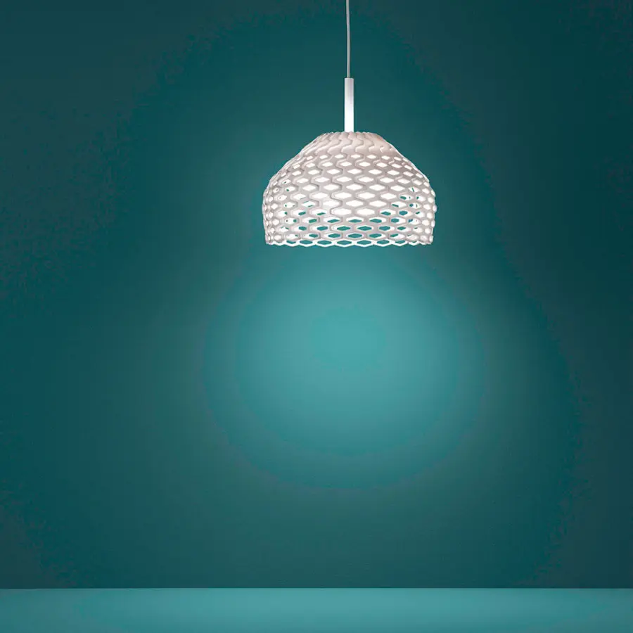 La sombra de la ‘carcasa’ de las luces protege la luz directa a los ojos y produce un juego armónico de luces y sombras a través de las secciones perforadas. Es a la vez un elemento decorativo y un práctico producto de iluminación.