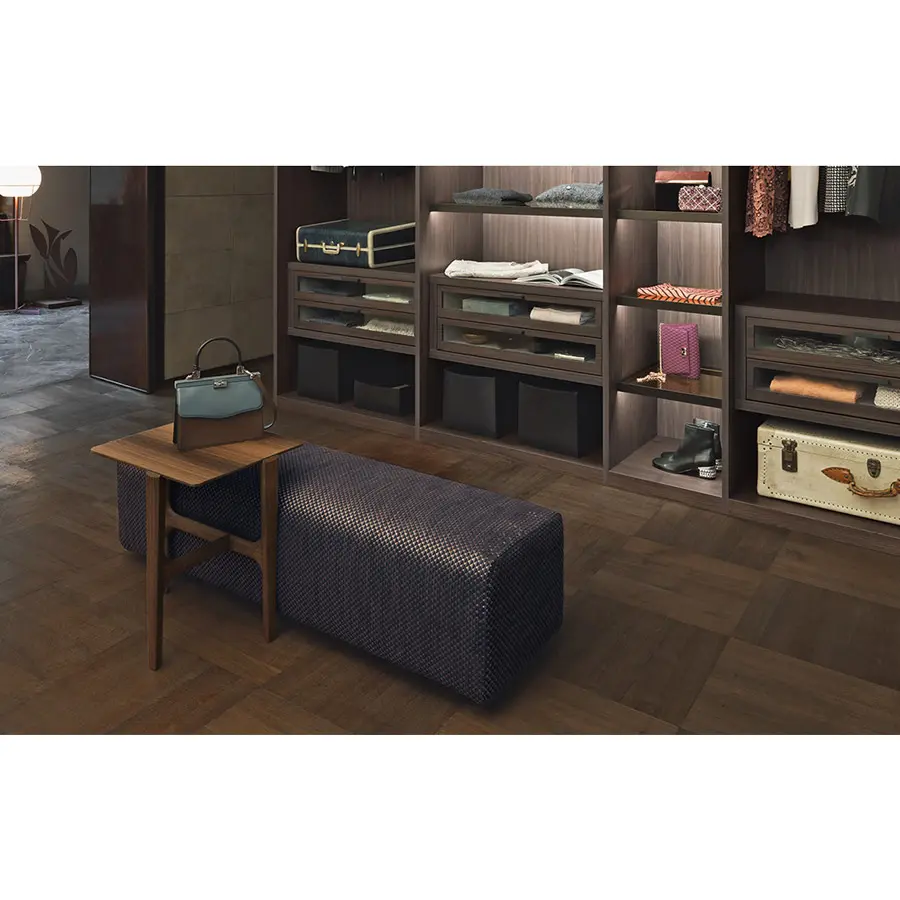 Banqueta con estructura en madera, correas elásticas y acolchado en espanso indeformable. Revestimiento desenfundable en tejido, piel o Ecopelle Dollaro. Patas en acero, barnizadas o cromadas, 4 cm de alto.