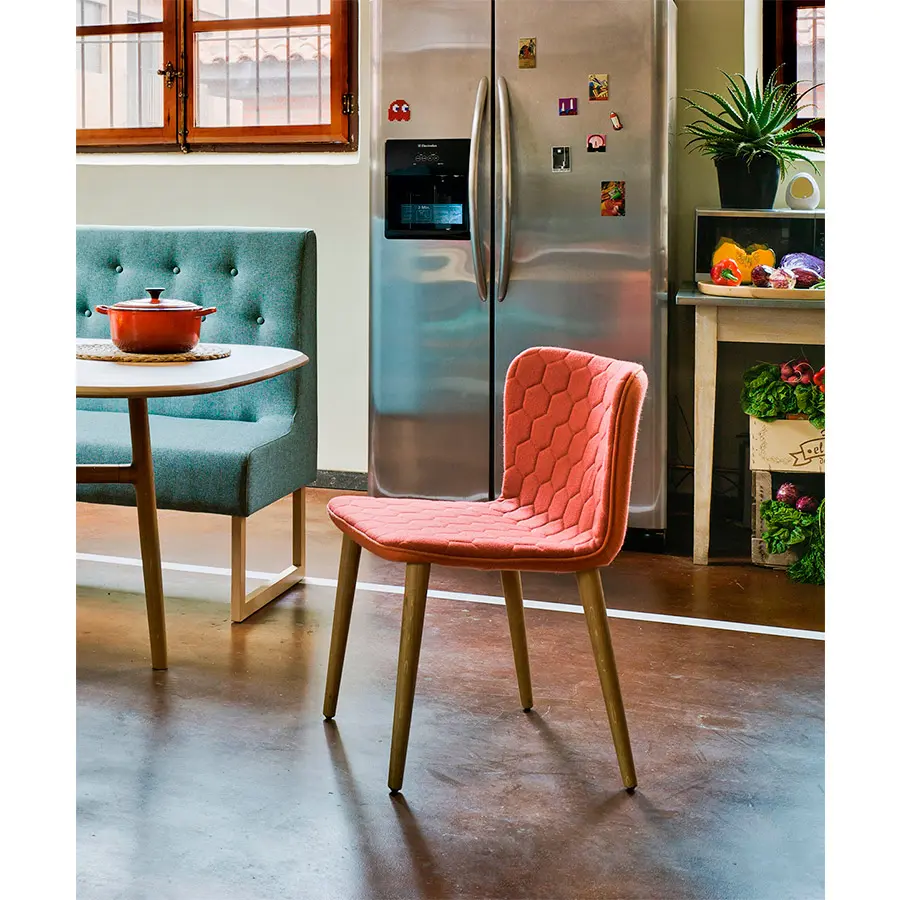 La colección Tea se caracteriza por incorporar un original acolchado de trama hexagonal en las zonas de asiento y respaldo. El vivo delimita dicho acolchado y lo diferencia del tapizado liso de la base. Al igual que sus predecesoras, el taburete permite crear piezas bi (bi-color y bi-texturas).