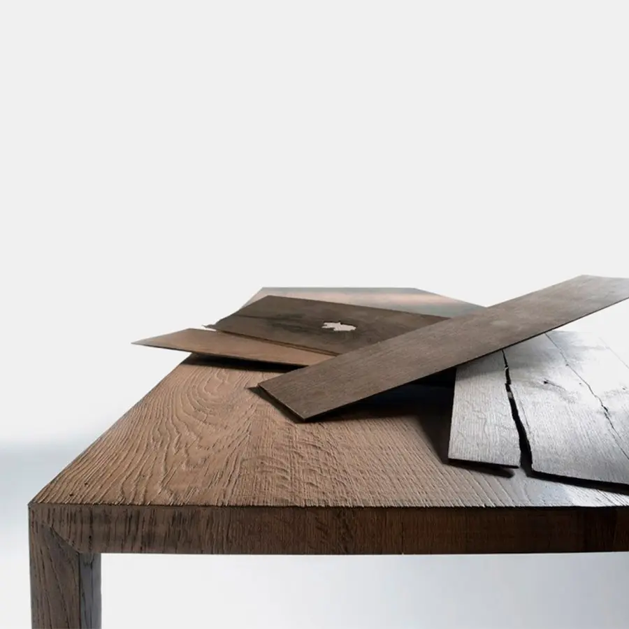 Diferentes combinaciones de vetas de madera, varios tonos y emociones para ser tocado. Tense Material está disponible en tres esencias de madera diferentes: roble natural, roble carbonizado y nogal nacional.
