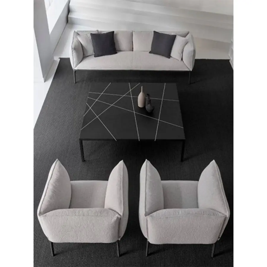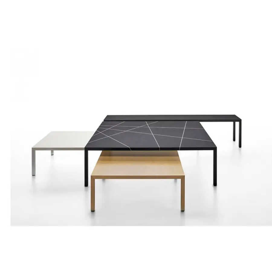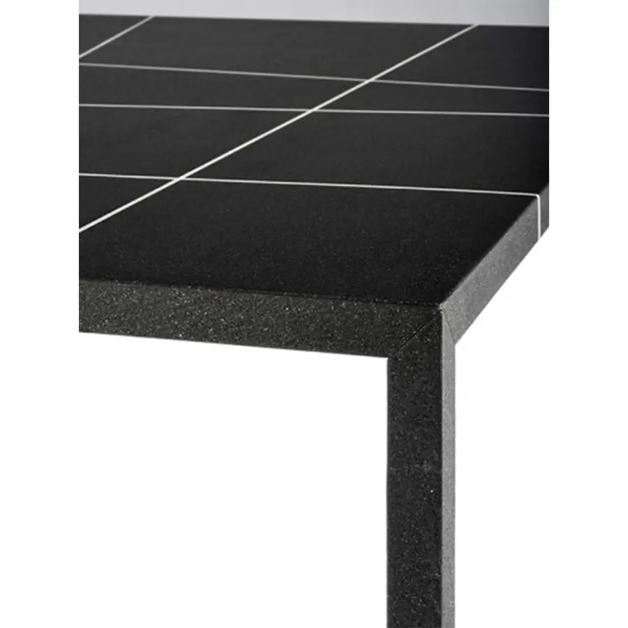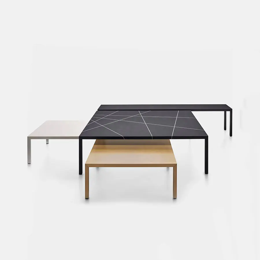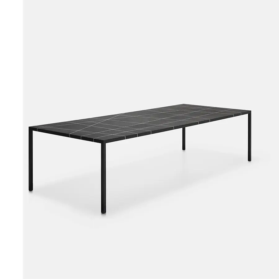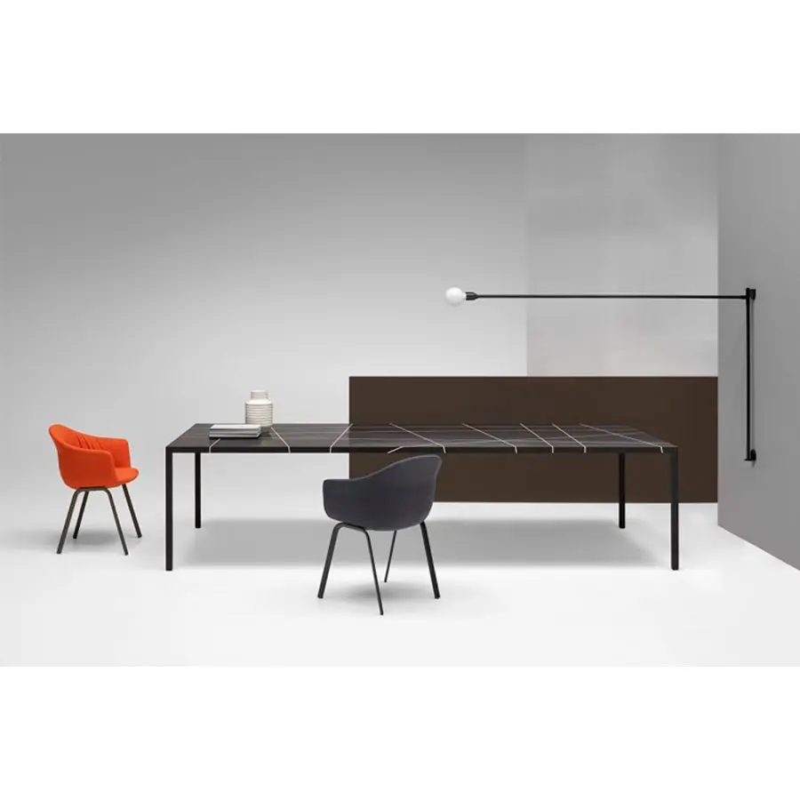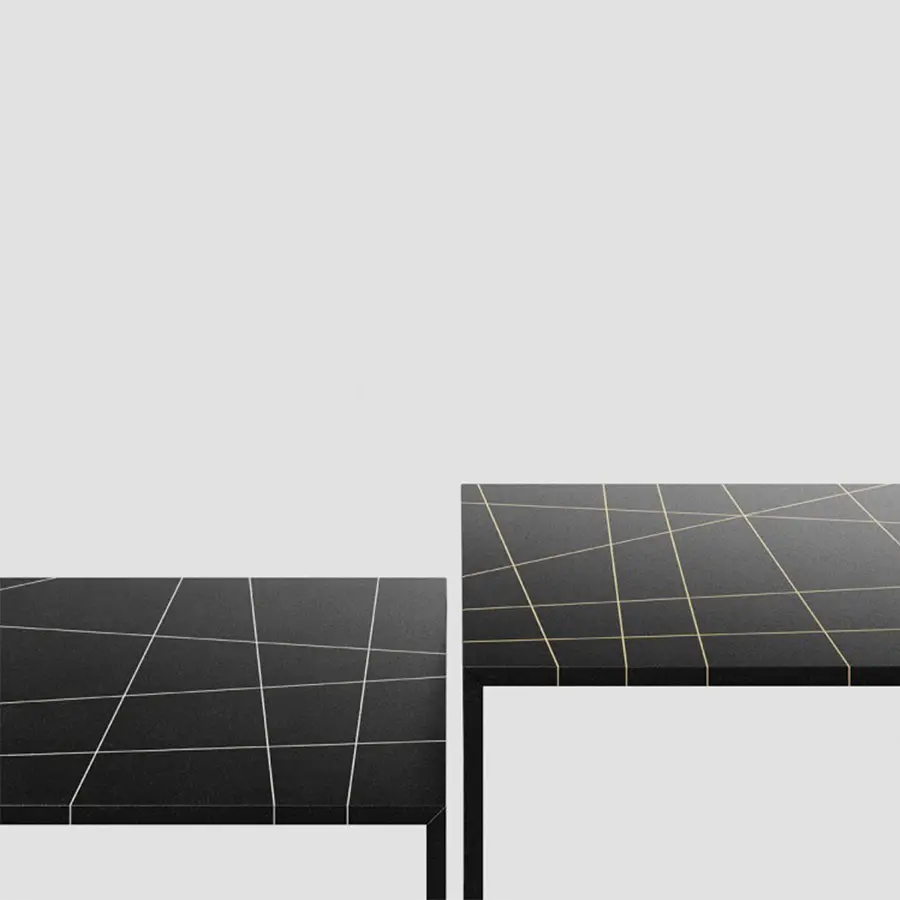 Este acabado particular se hace comenzando con polvo de mármol que se ha mezclado con un relleno y luego se extiende manualmente sobre toda la superficie de la mesa. Después de haber sido lijado cuidadosamente, se ha diseñado una incrustación de intarsia de acuerdo con los roles de la famosa teoría del «plano de línea de puntos» elaborada por Kandinsky, y terminada con un tratamiento particular de pintura y cera natural. Disponible en la parte superior de ébano negro con intarsia en mármol blanco de Carrara o intarsia en bronce.