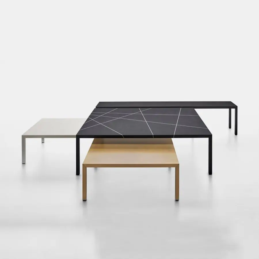 Encimera de mármol, se desarrolla a partir de polvo de mármol que, mezclado con un aglutinante, se extiende manualmente sobre todo el tablero de la mesa. El resultado es una superficie sólida y compacta. El mármol reconstruido conserva todas las características del material original, con el beneficio de hacer que toda la estructura sea más ligera. Disponible en dos variantes, ébano negro y Carrara blanca.