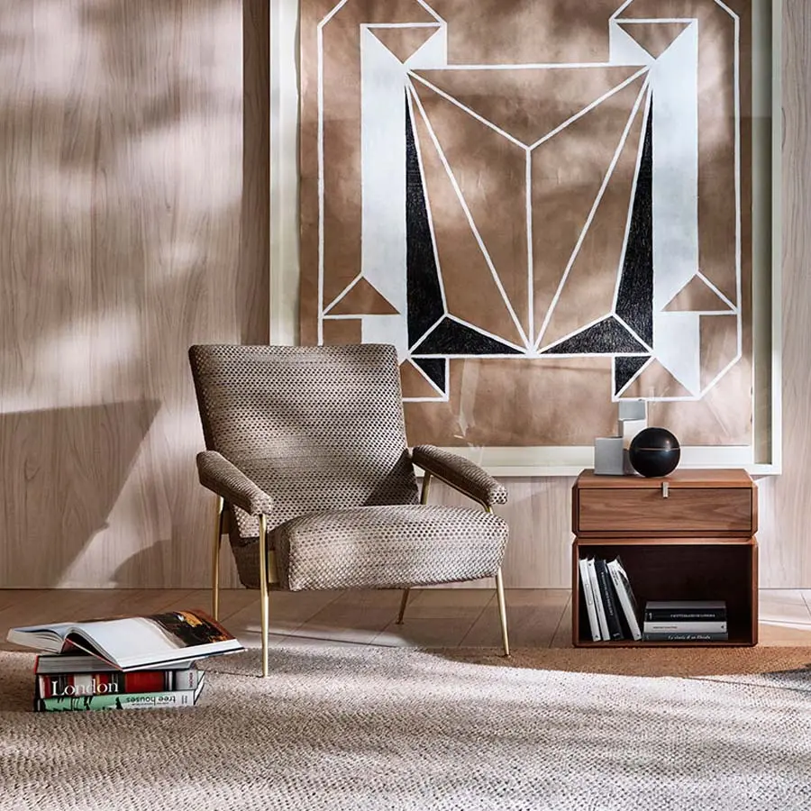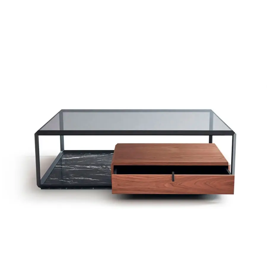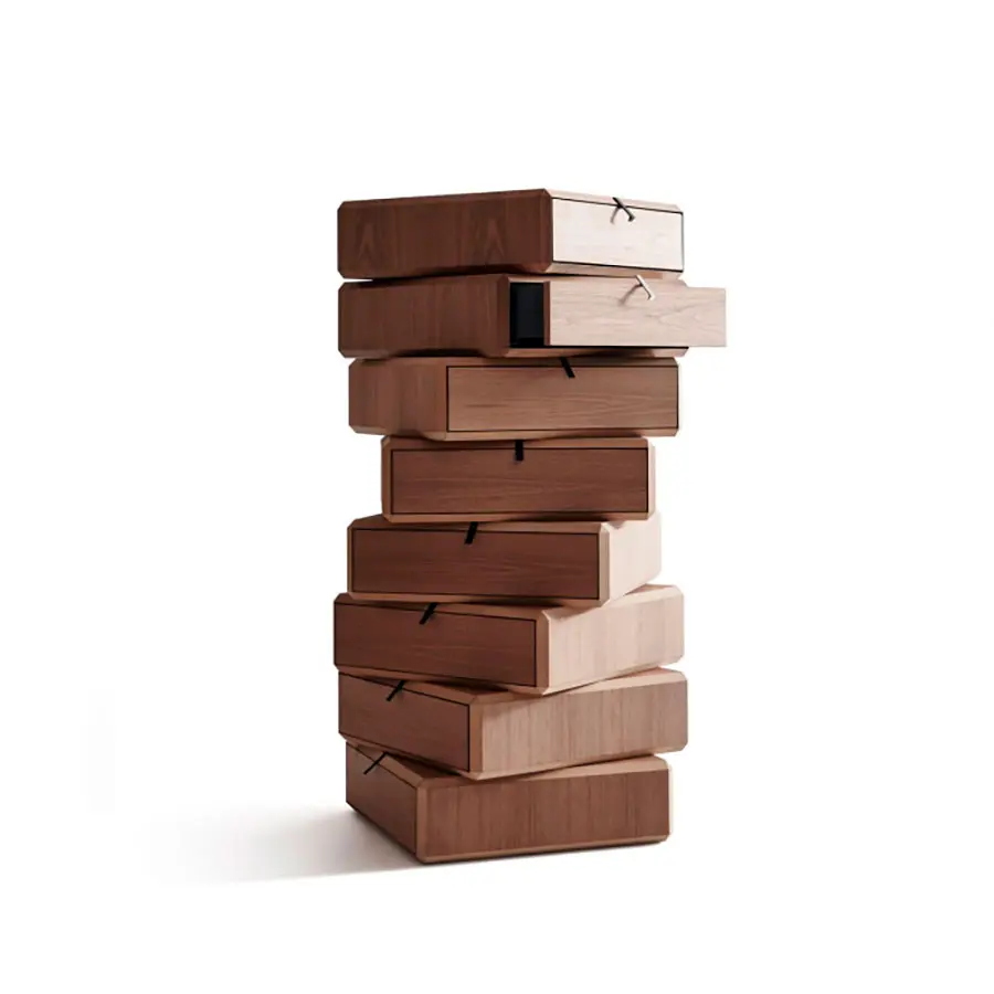 Ron Gilad transforma la cajonera – caracterizada por elementos colocados de una manera desalineada con respecto el eje central – en un mueble contenedor donde la contención y la partes abiertas acristaladas se solapan plasmando un sólido único de superficie multifacética. Los cajones pueden colocarse alineados o inusualmente desalineados con respecto al resto del mueble. La realización, siempre en Nogal Americano o Eucalipto, es la unión perfecta entre la precisión micrométrica de la elaboración mecánica y la maestría artesanal en el plegado y el encolado de los elementos estructurales. Serie de contenedores abiertos o con cajón en nogal americano. Elemento individual o compuesto solapando elementos diferentes para plasmar mesillas, cajoneras, composiciones para la zona salón lineales o irregulares, o en cuanto caja de apoyo sobre la base de mármol de las mesitas 45°.