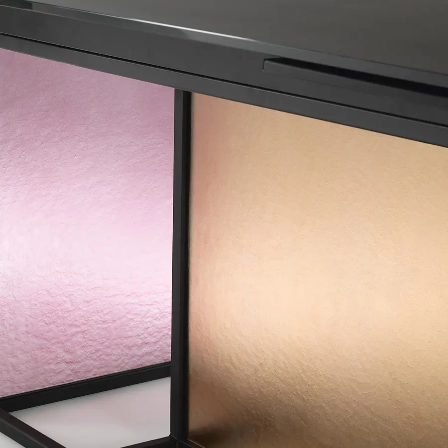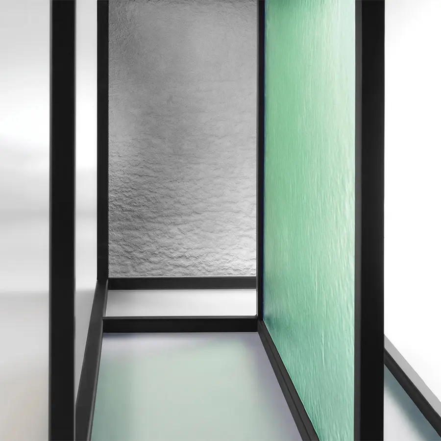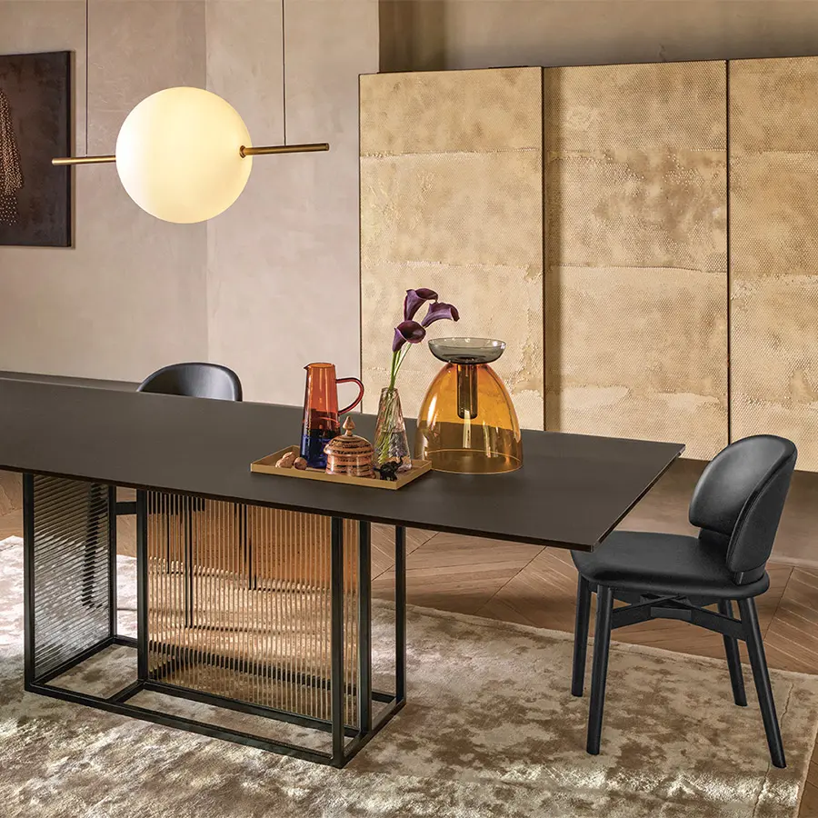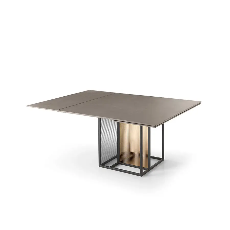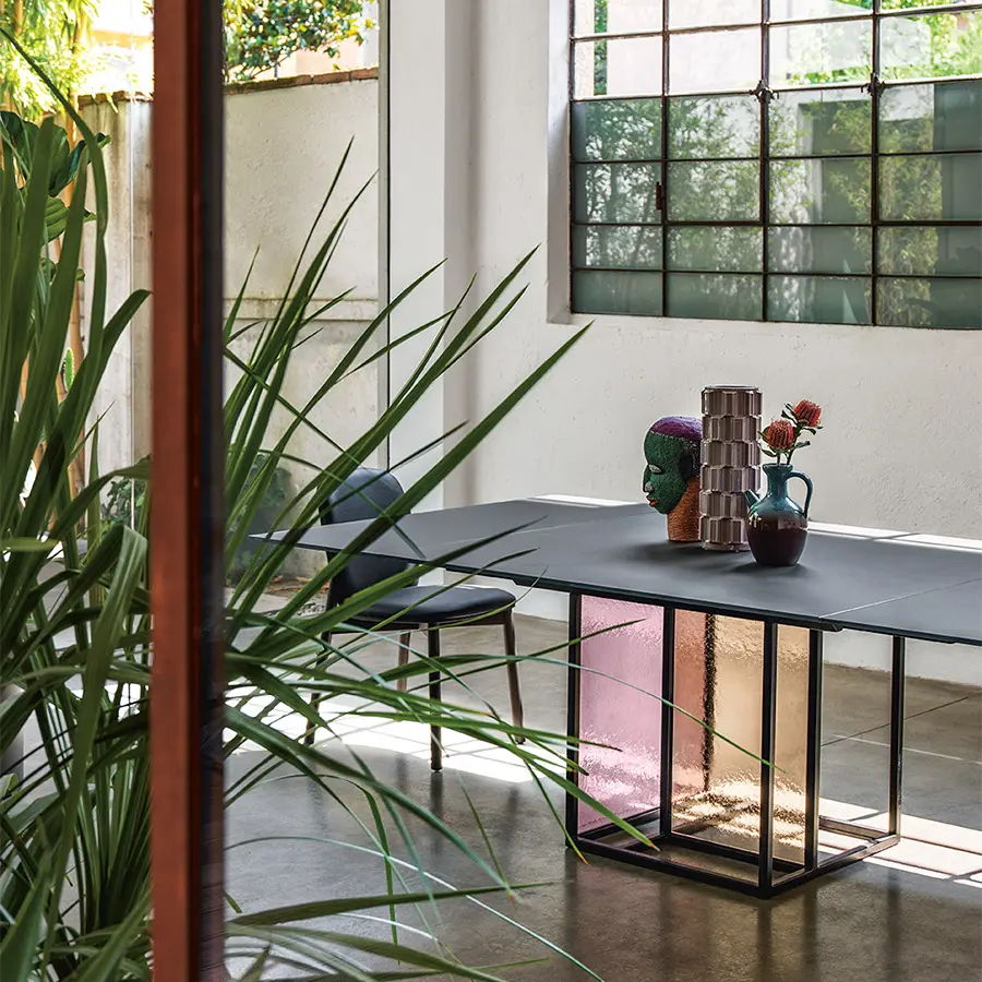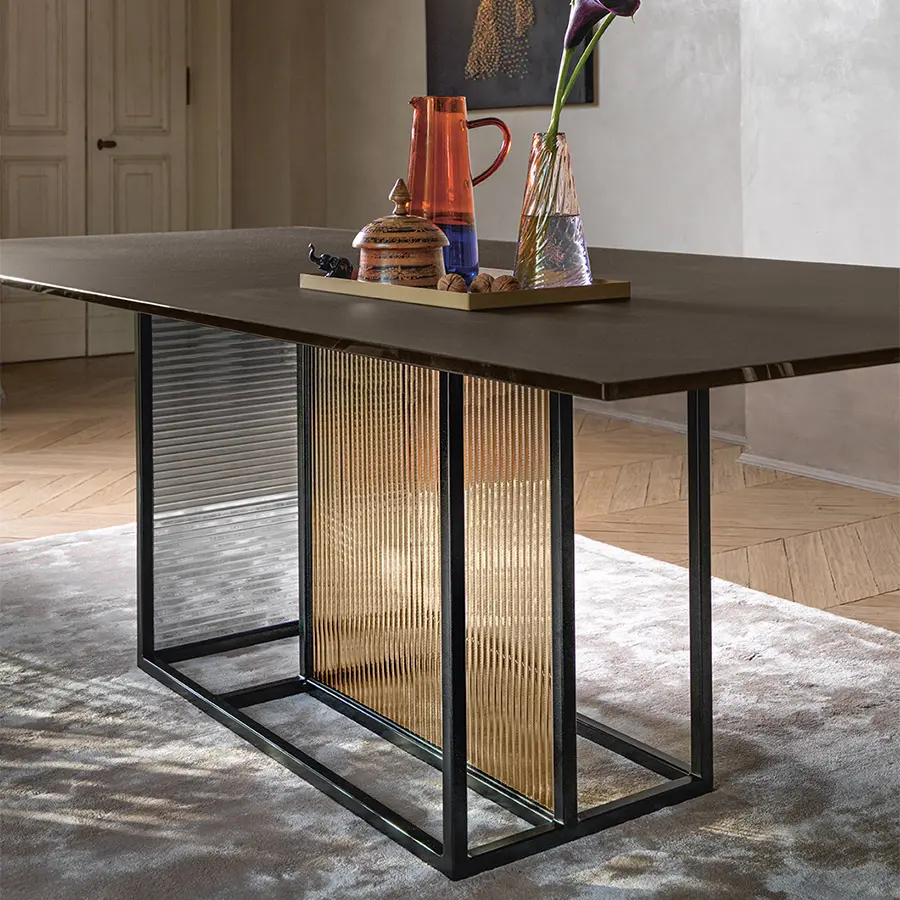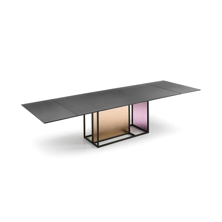 Mesa con base compuesta por un marco de metal pintado, acabado negro mate, sobre el que se aplican dos vidrios templados y fundido de 6 mm, disponibles en los siguien tes acabados: vidrio transparente con textura rayada; vidrio ahumado y bronce con textura rayada; vidrio transparente con textura gofrada, pintado al dorso en las tonalidades transparentes de Ámbar y polvo Rosa ; vidrio transparente con textura gofrada, pintado al dorso en las tonalidades transparentes de Verde Algas y Humo. Tapa en vidrio templado de 12 ó 15 mm, disponible en las siguientes variantes: vidrio transparente retrobarnizado con tonalidades monocromáticas; vidrio transparente acidado y retrobarnizado con tonalidades metálicas; vidrio transparente cubierto de Ecomalta, espatolatura a mano de grano fino. Opción extensible.