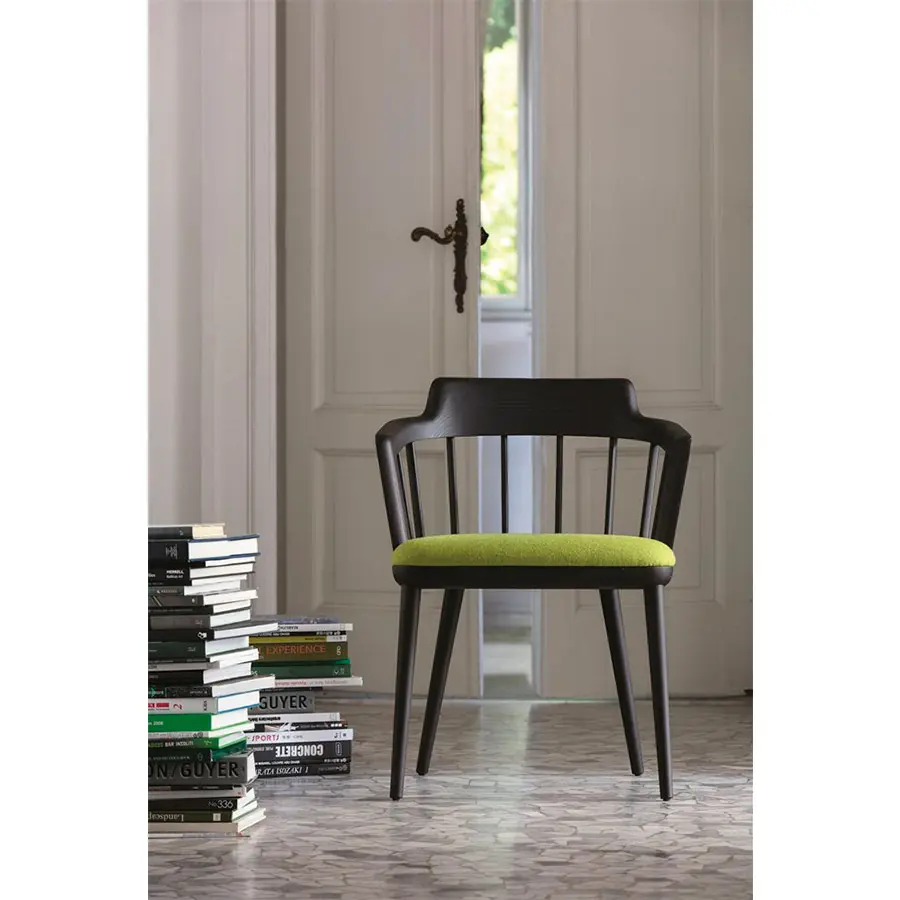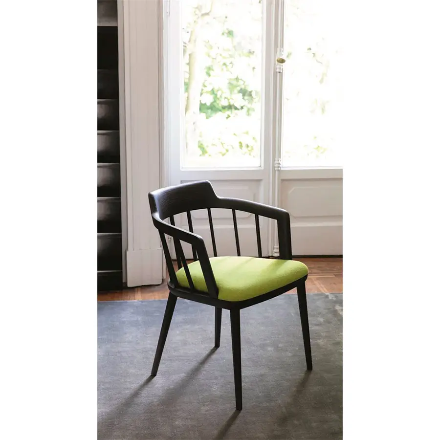 Silla con brazos con estructura de nogal canaletta macizo y asiento revestido en las telas de la colección.