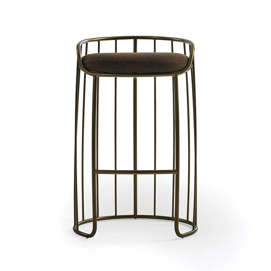 La almohada de asiento, tapizada en tela o piel, adopta una recatada presencia y dota de una estética liviana, casi etérea, a la totalidad del conjunto. La base está disponible en dos alturas y dos acabados metalizados: bronce y nácar.