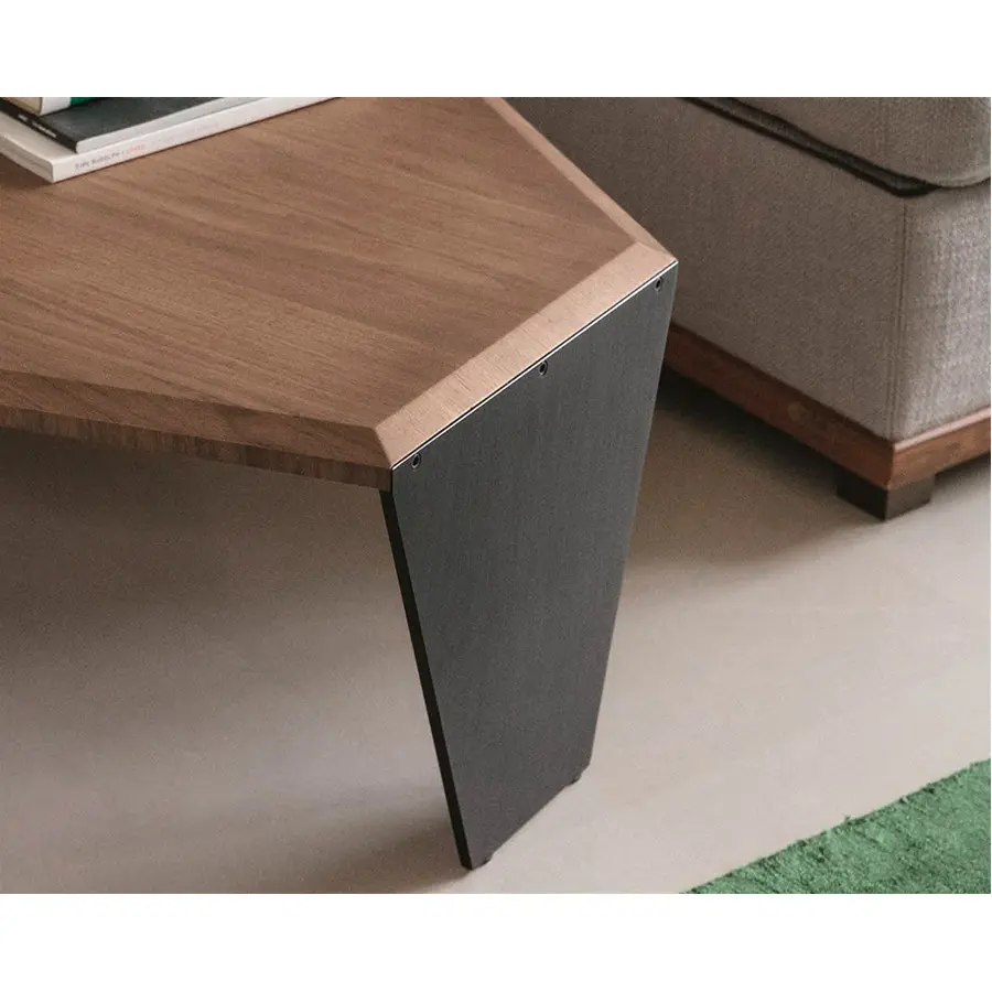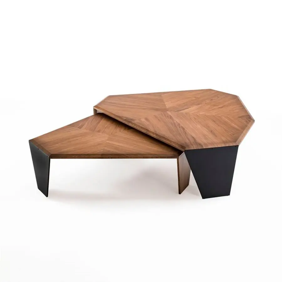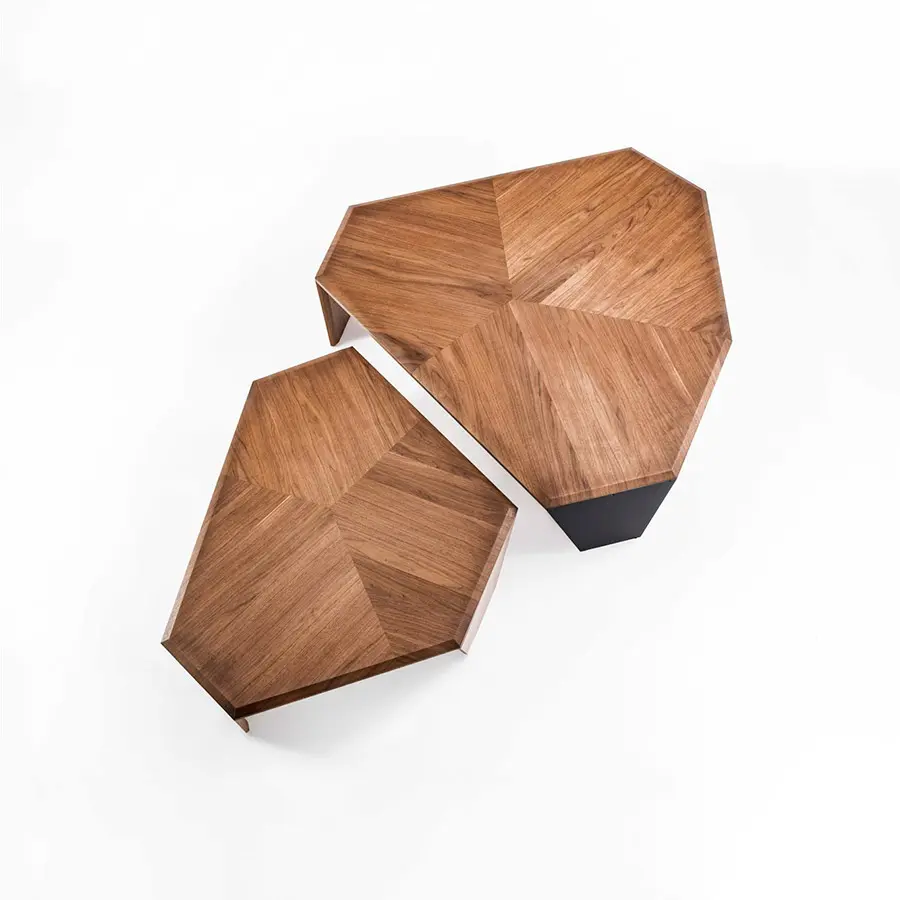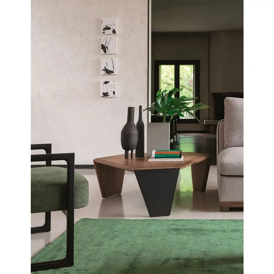 Mesa de centro en nogal canaletta con chapa taraceada, dos patas de madera y una de metal en acabado negro mate. Disponible en dos medidas – 147x134x41 – 108x102x35,5 – Tortuga nace de una idea completamente diferente a la típica mesa de centro. Esta mesa sin duda capta las miradas, integrándose perfectamente en los ambientes más exigentes, cumpliendo todas las expectativas.