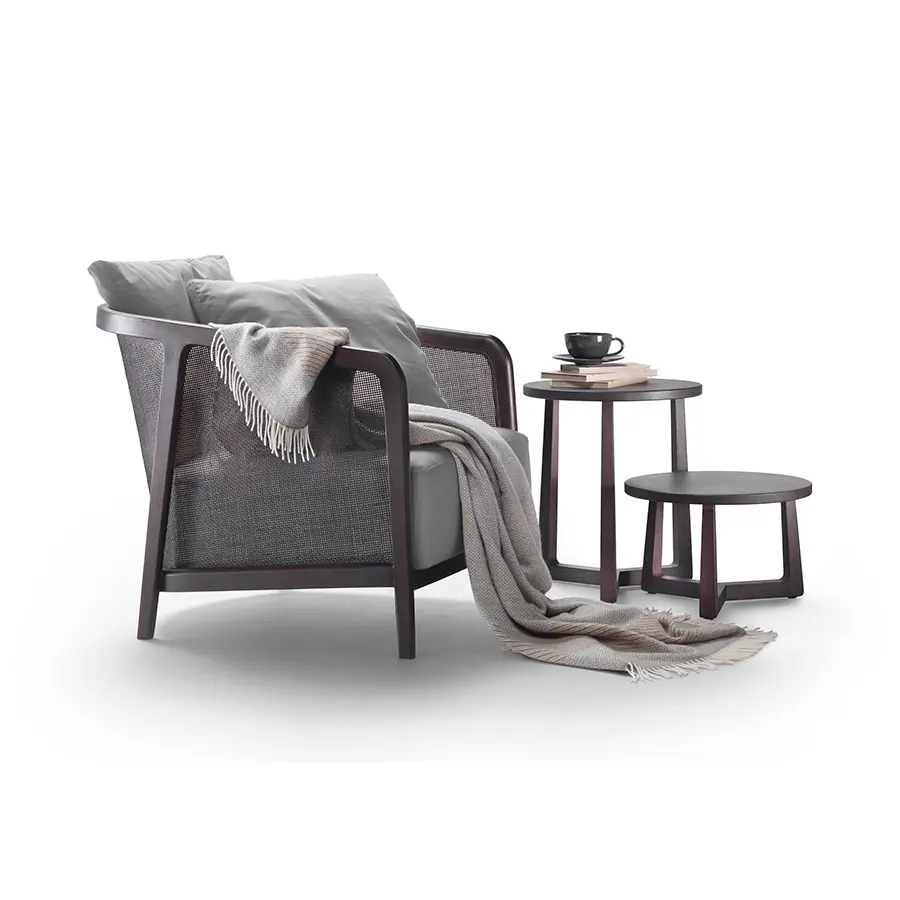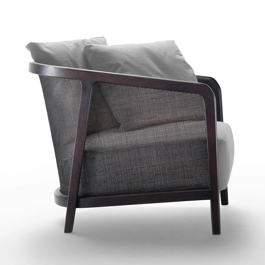 Un elegante sillón de sabor neocolonial, interpretado en clave contemporánea. La estructura ligera de madera maciza –nogal americano y fresno barnizado en una pluralidad de refinados tonos– enmarca el respaldo de junco trenzado, barnizado en combinación con el acabado elegido para la estructura. Gracias a sus proporciones contenidas y a su impecable elegancia formal, el sillón Tosca desempeña un papel protagonista en cualquier entorno, solo o en combinación con los sofás de la colección Flexform.