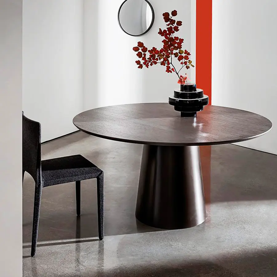 Mesa de comedor con base en metal cromado o lacado en diferentes acabados. Tapa de vidrio templado o madera laminada