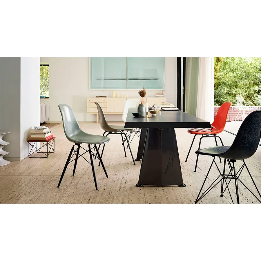 Jean Prouvé diseñó originalmente la mesa Trapèze para la Cité Universitaire de Antony, cerca de París. La forma trapezoidal de las patas de chapa de acero inspiraron el nombre de la mesa y también le dieron su carácter inconfundible. La robusta mesa Trapèze está disponible en dos tamaños.