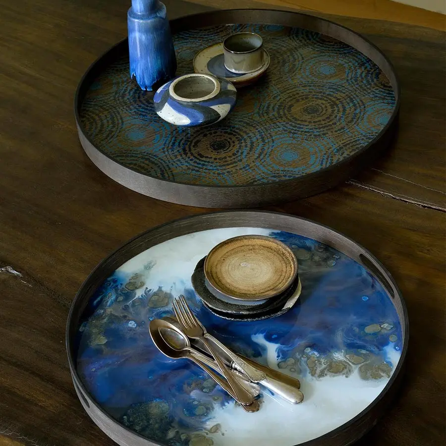 La colección de mesas auxiliares de Notre Monde, se mueve entre la curiosidad por la vida y los viajes alrededor del mundo, la recopilación de imágenes y sensaciones, dan lugar a productos y accesorios sin limitaciones. Sus múltiples inspiraciones han dado lugar a composiciones pictóricas extremadamente ricas, basadas en patrones abstractos, complejos y modernos, organizados en combinaciones y capas sucesivas que interactúan con materiales, colores, texturas y acabados.