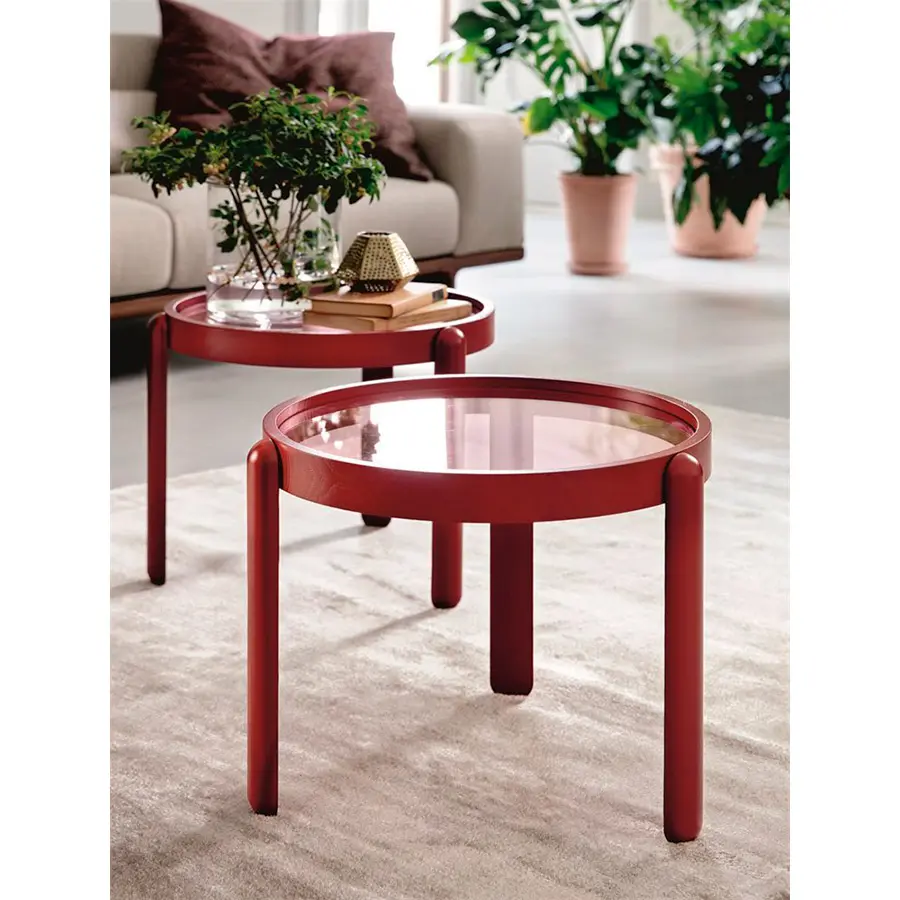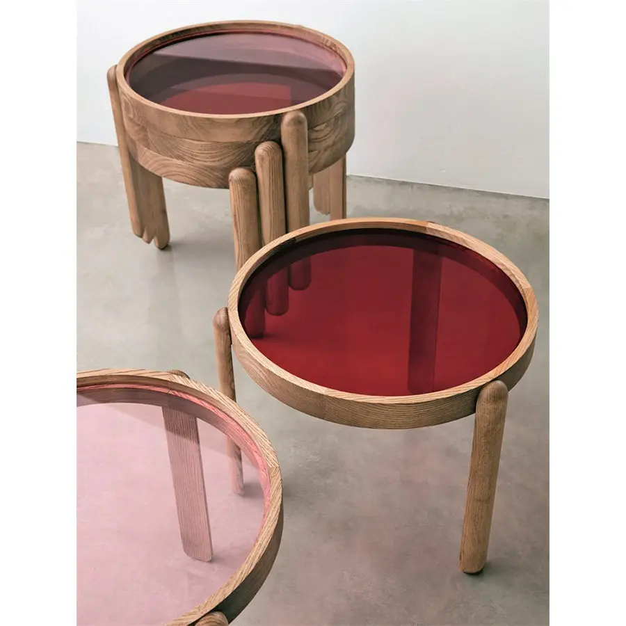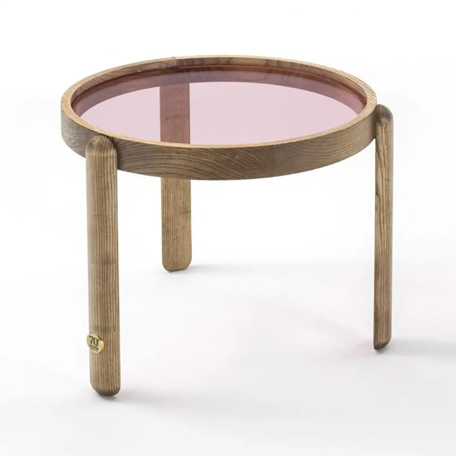 Mesa auxiliar redonda con estructura de fresno macizo y tapa de cristal templado biselado. Apilable.