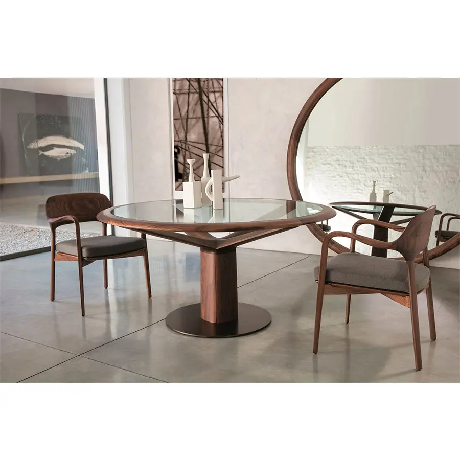 Mesa con tapa de cristal transparente templado (espesor mm. 12) con marco y soportes de nogal canaletta macizo. La base revestida de nogal canaletta macizo está montda encima de un disco de metal en acabado bronzoro. Disponibles en diametro 150 – 180