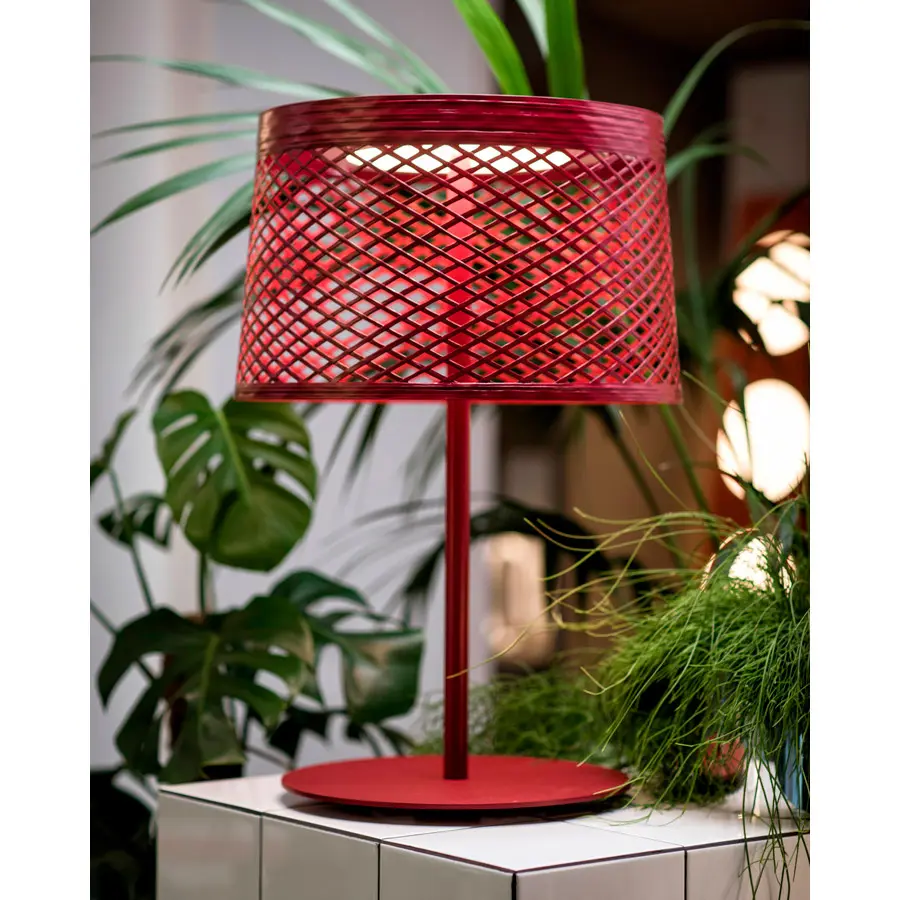 Lámpara de mesa de exterior de luz directa hacia abajo. Difusor y poste en material composite sobre base de fibra de vidrio pintado con líquido. El difusor está hecho de tiras de material compuesto modeladas manualmente sobre el molde, las cintas superpuestas crean la superficie trenzada que sucesivamente se pinta a mano.
