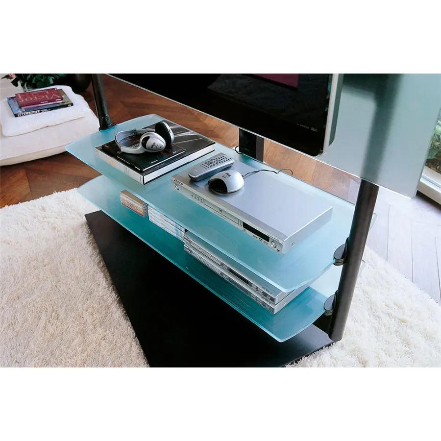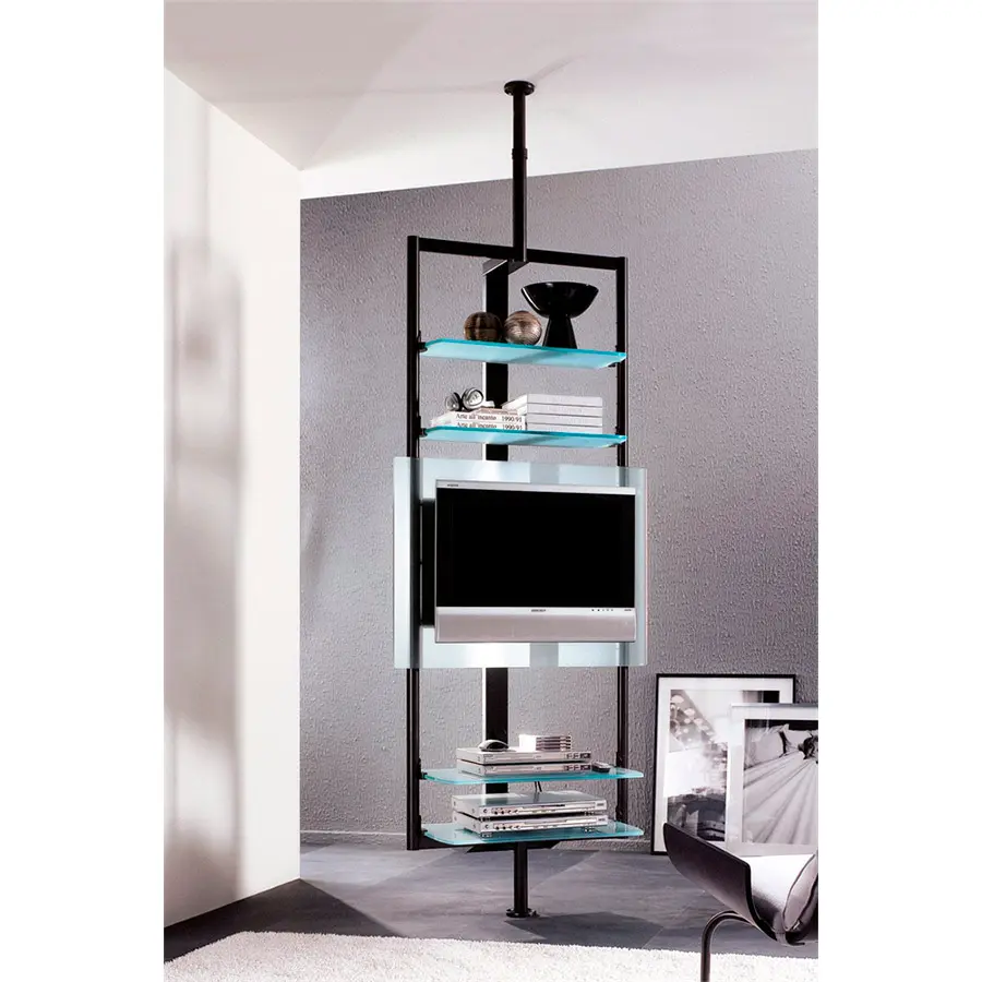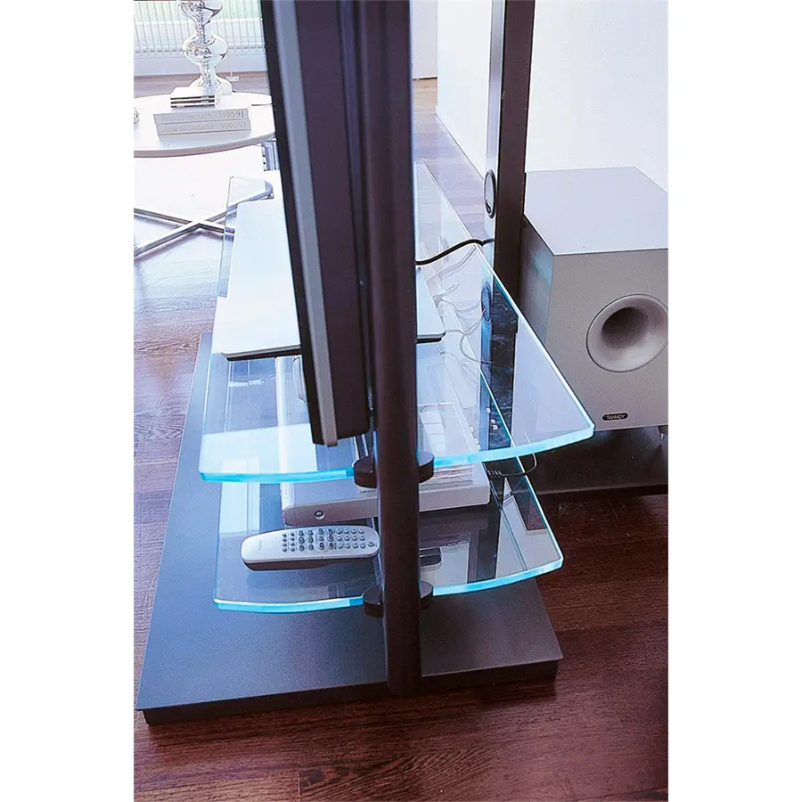 Porta TV con estructura de metal componible con varios accesorios de cristal o de madera.