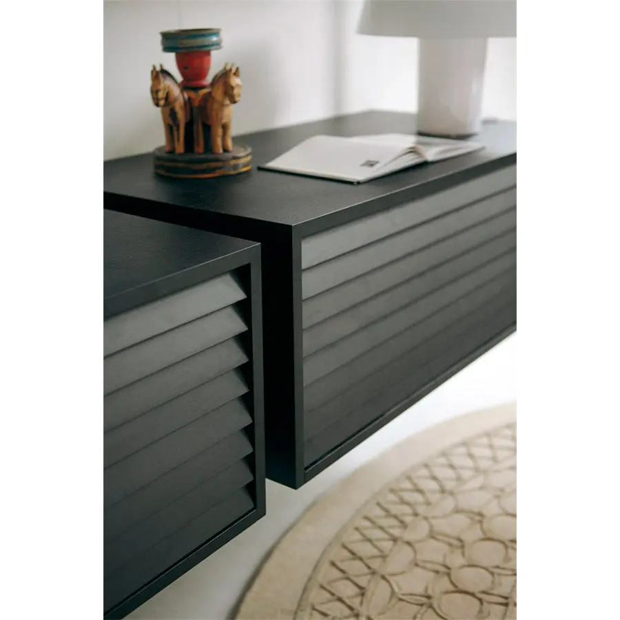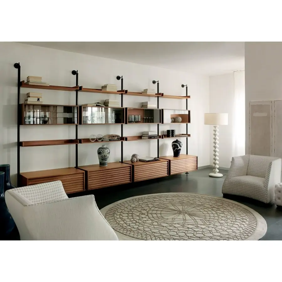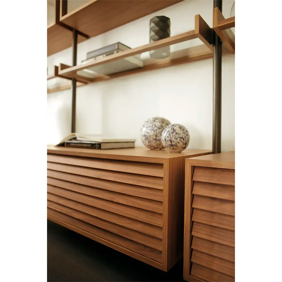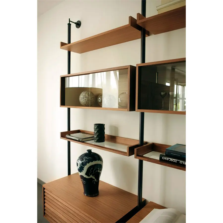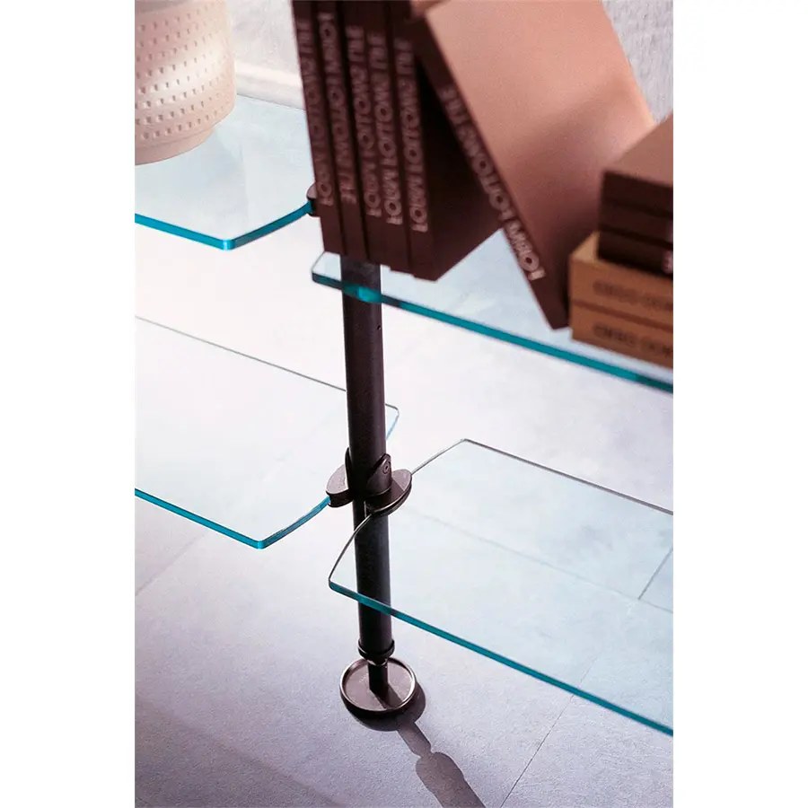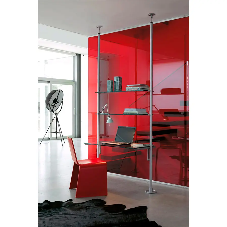Sistema constituido por columnas de metal fijadas entre suelo y techo o a la pared. Es posible personalizar la composición con contenedores, baldas y cajoneras de madera y cristal posicionables a diferentes alturas.