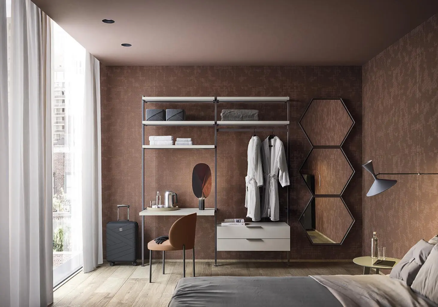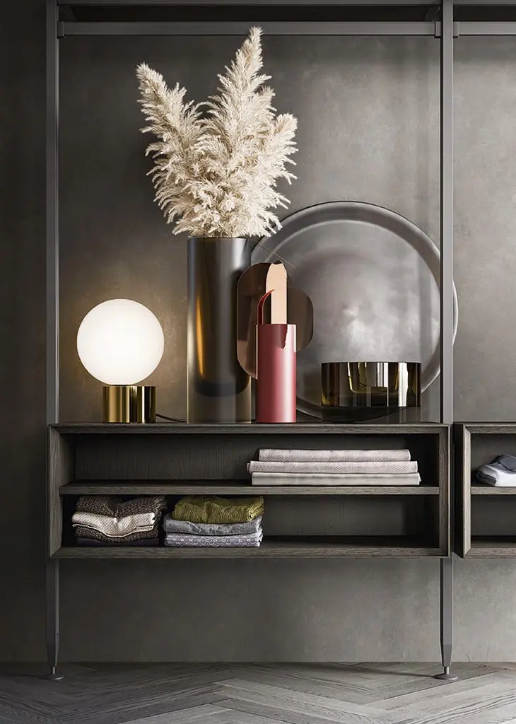 Antis es un armario vestidor de diseño que se destaca por sus montantes ajustables, lo que le permite seleccionar la altura y la disposición de los elementos según su preferencia, brindando así una amplia gama de configuraciones posibles. La versatilidad de los montantes permite una libertad total en la configuración de este armario vestidor. Además, gracias a un práctico sistema de enganche, es posible modificar o complementar la disposición visualmente del armario más adelante, adaptándola a las necesidades cambiantes del cliente. Entre los numerosos accesorios se incluyen estantes de madera o cristal, barras para colgar prendas, escritorios, organizadores de pantalones y una variedad de opciones adicionales.