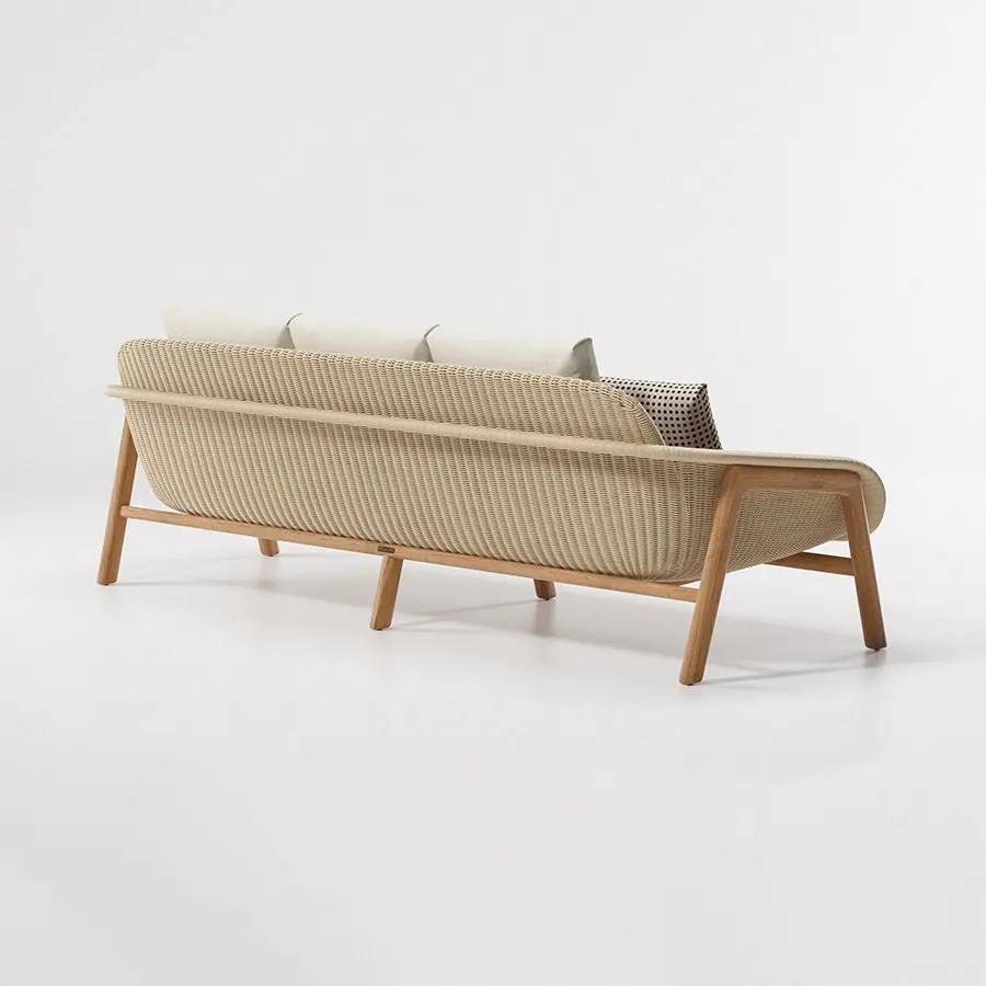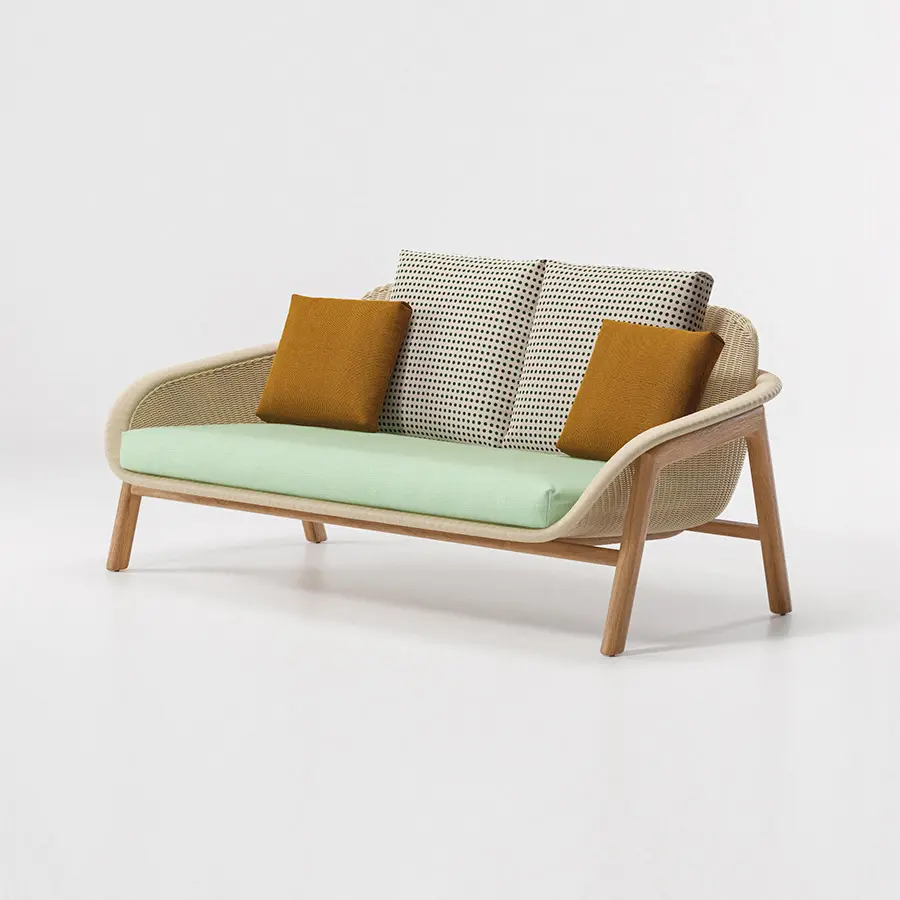 Sofá 2 plazas con pies en Madera Teca, de la colección Vimini por Patricia Urquiola, creado con una estructura de madera, mas tosca y con una carcasa de fibra sintética. Esta colección te hará sentir en casa gracias a sus acabados y diseño.