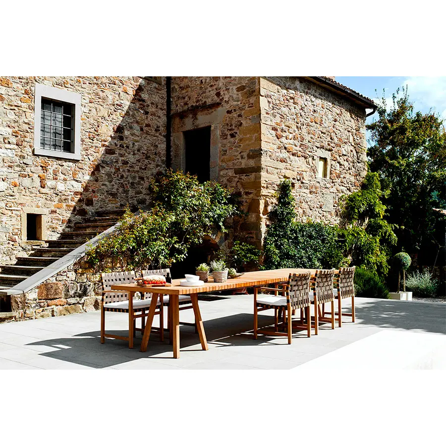 La colección Vis à vis aporta una nueva dimensión al mobiliario de exterior de madera. La teca es el material de exterior favorito del diseñador Piergiorgio Cazzaniga, ya que es natural, suave y extremadamente duradero. Cuando empezó a diseñar la colección, pensaba en un lugar en el que se puede disfrutar más del aire libre y de la comunicación en compañía.
