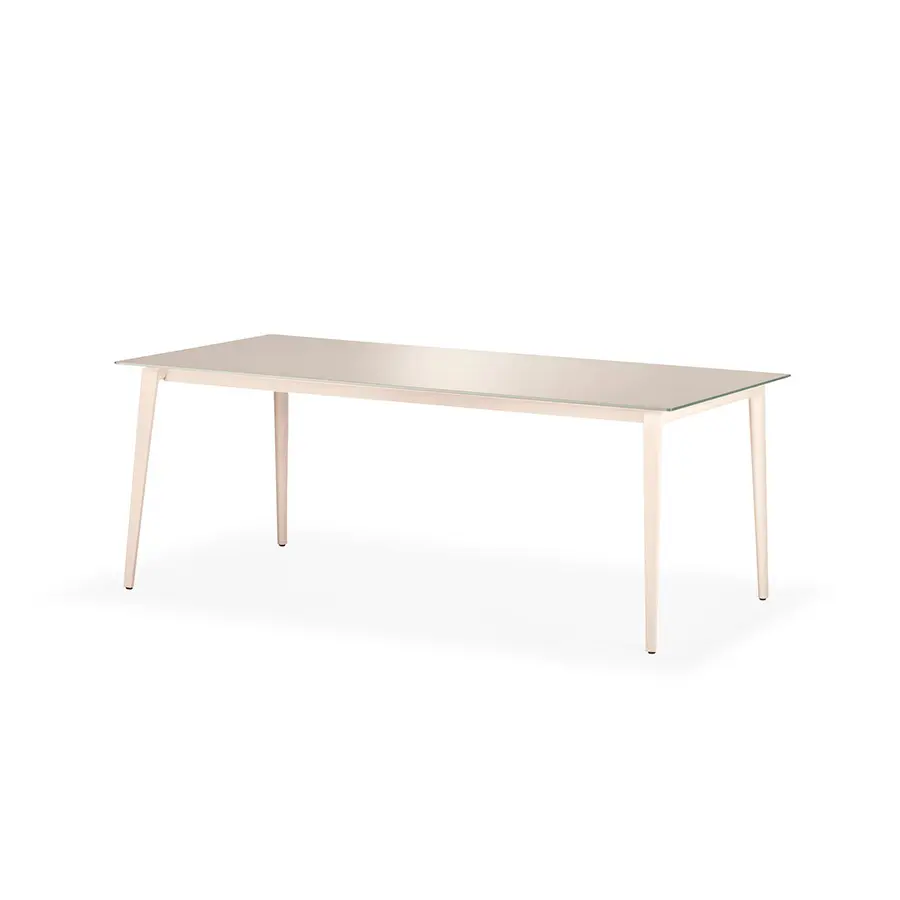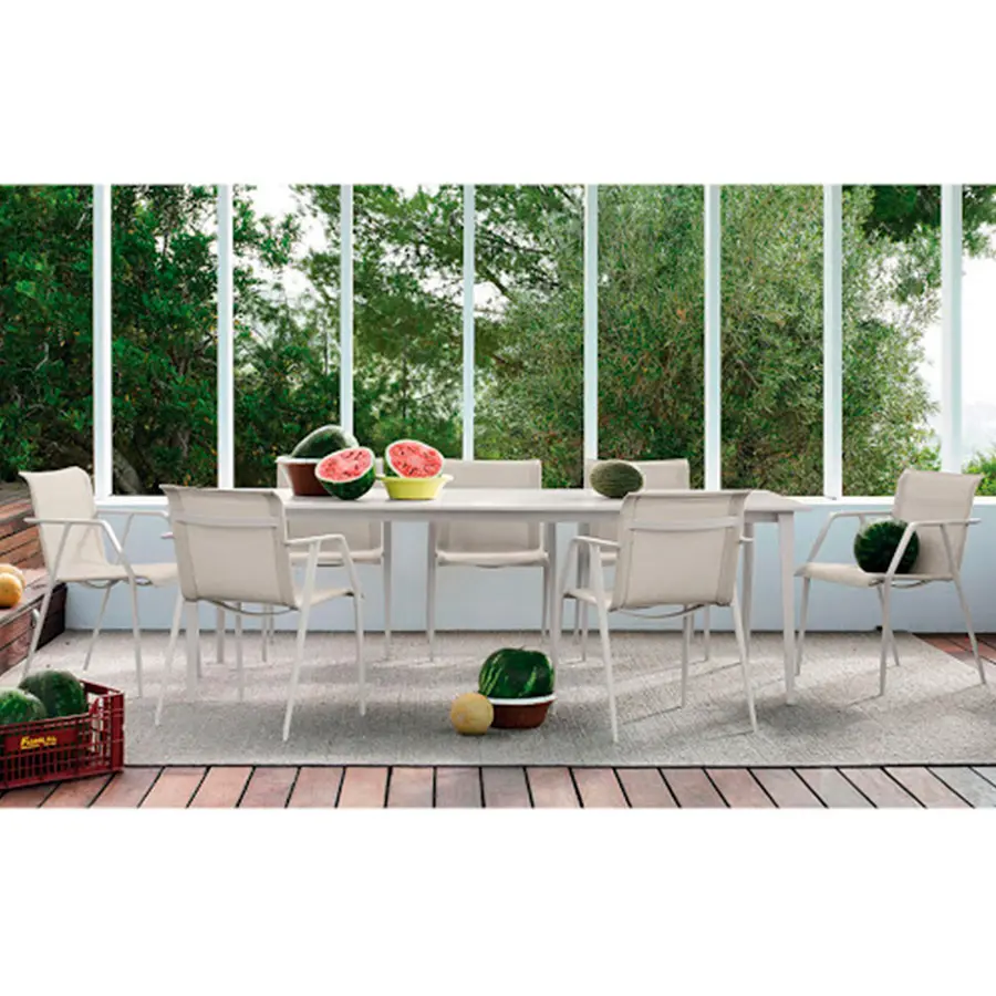 La mesa de comedor WA presenta patas de aluminio inoxidable, anguladas y rematadas para rememorar las de la silla con brazos. El tablero de mesa está hecho con el innovador sistema “Slim-box”, es decir una caja de acero inoxidable con un núcleo de espuma de poliuretano que absorbe ruidos y confiere al tablero de extrema ligereza y robustez. Toda la mesa está revestida con pintura en polvo de poliéster con un atractivo acabado texturizado. Las mesas están disponibles en cuatro tamaños, dos de los cuales son ampliables gracias a un mecanismo que les permite abrirse e insertar una ampliación.