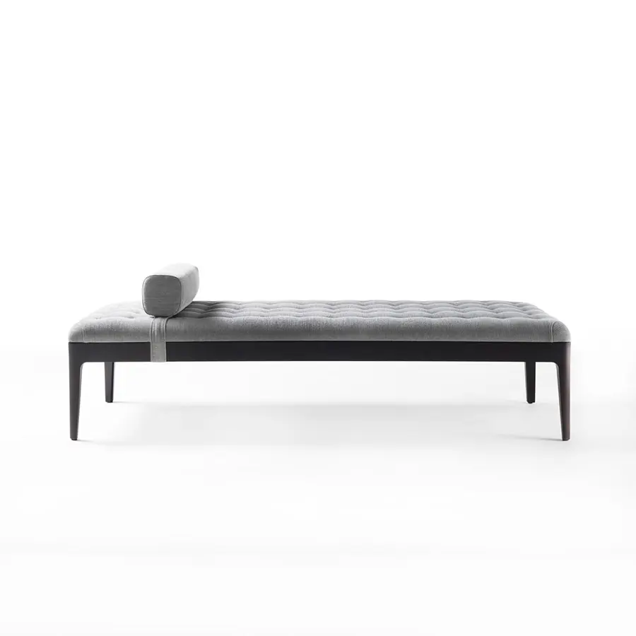 Cama de día con estructura de nogal canaletta macizo y revestida con motivo capitoné en las telas de la colección. Posibilidad de pedir los botones tono sobre tono o en contraste. Dimension 183x73x42