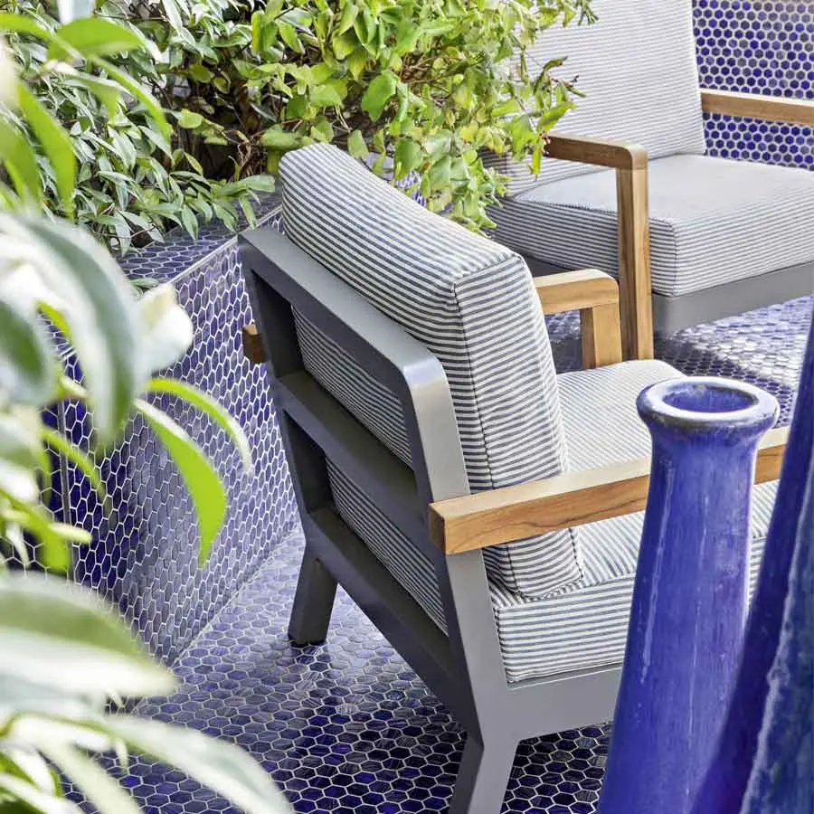 El sillón Win 05 combina la ligereza del aluminio de la estructura, disponible en los acabados blanco y gris, con la ductilidad y resistencia de la teca natural, utilizada para los brazos. El asiento es bajo y confortable, gracias a profundos cojines desenfundables, utilizados también para el respaldo, y junto a los cojines de apoyo, para un marcado confort.