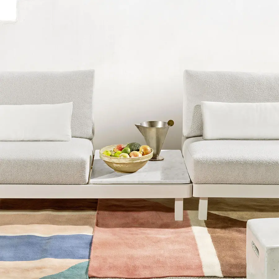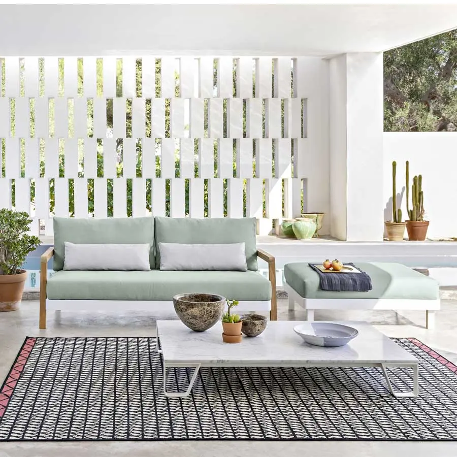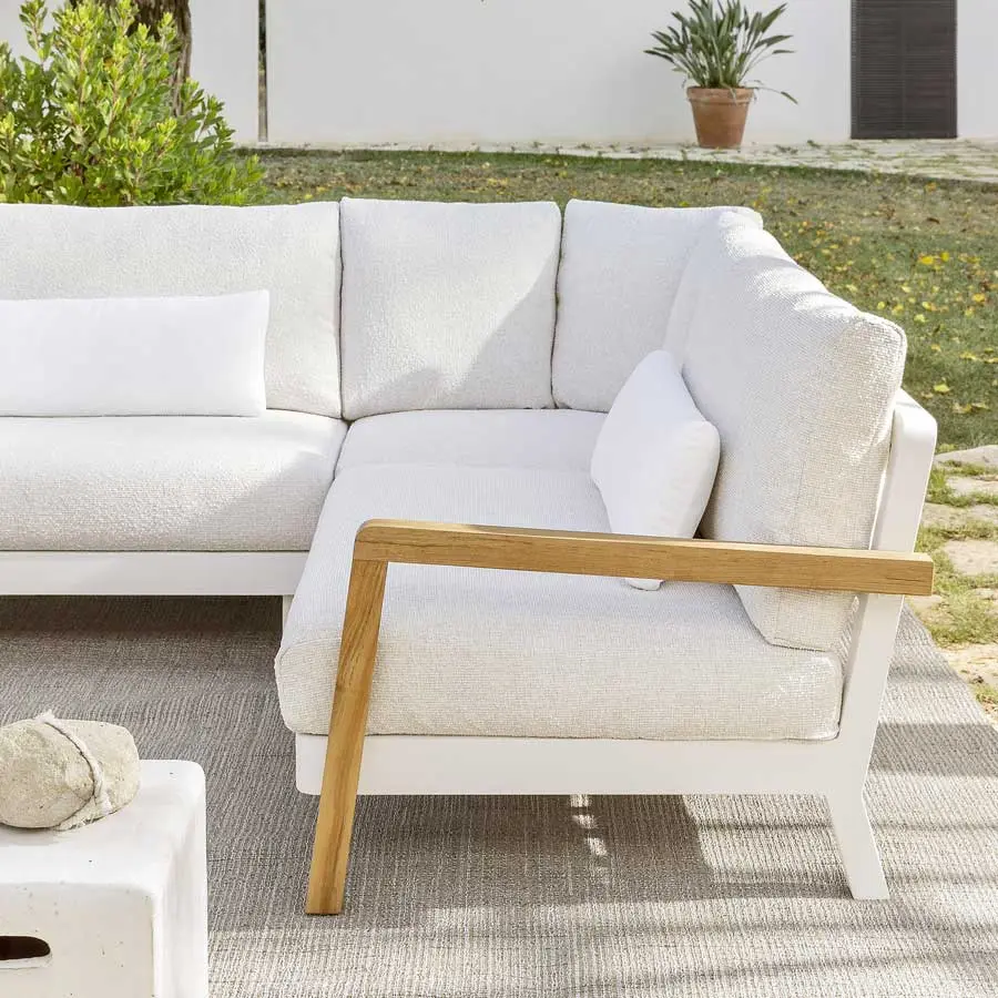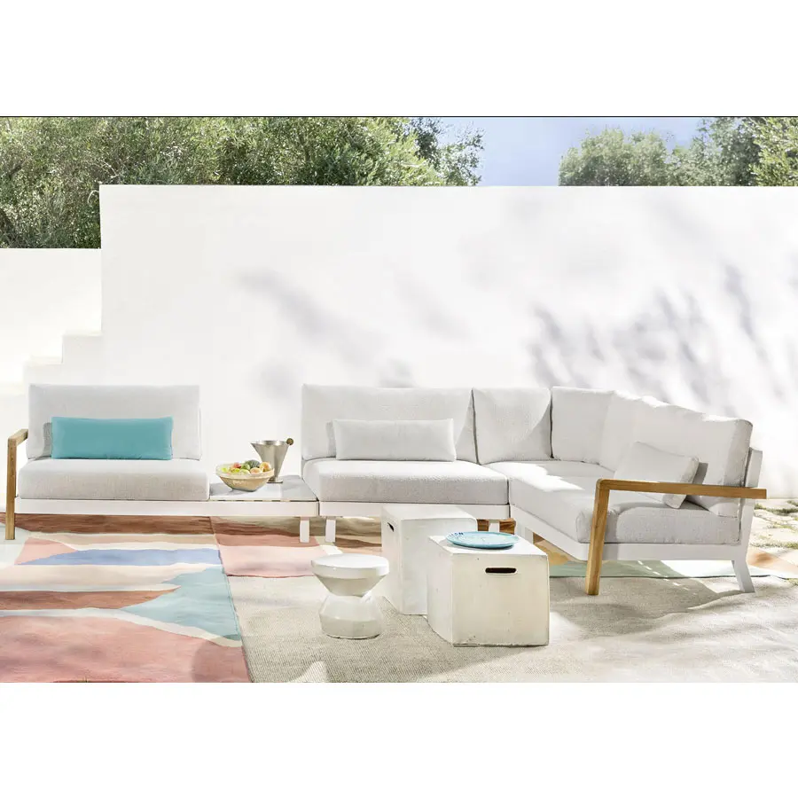 La familia de sofás WIN combina la ligereza del aluminio de la estructura, disponible en los acabados blanco y gris, con la ductilidad y resistencia de la teca natural, utilizada para los brazos. Los asientos bajos son confortables, gracias a profundos cojines desenfundables, utilizados también para el respaldo, junto a cojines de apoyo, para un marcado confort.