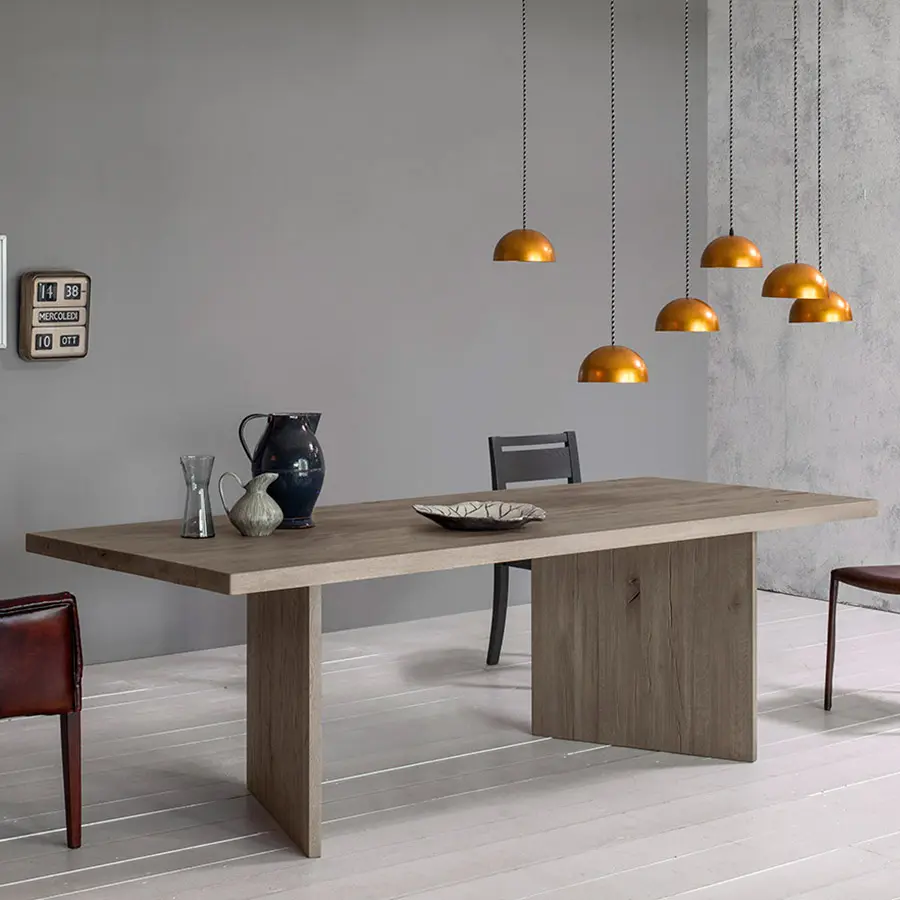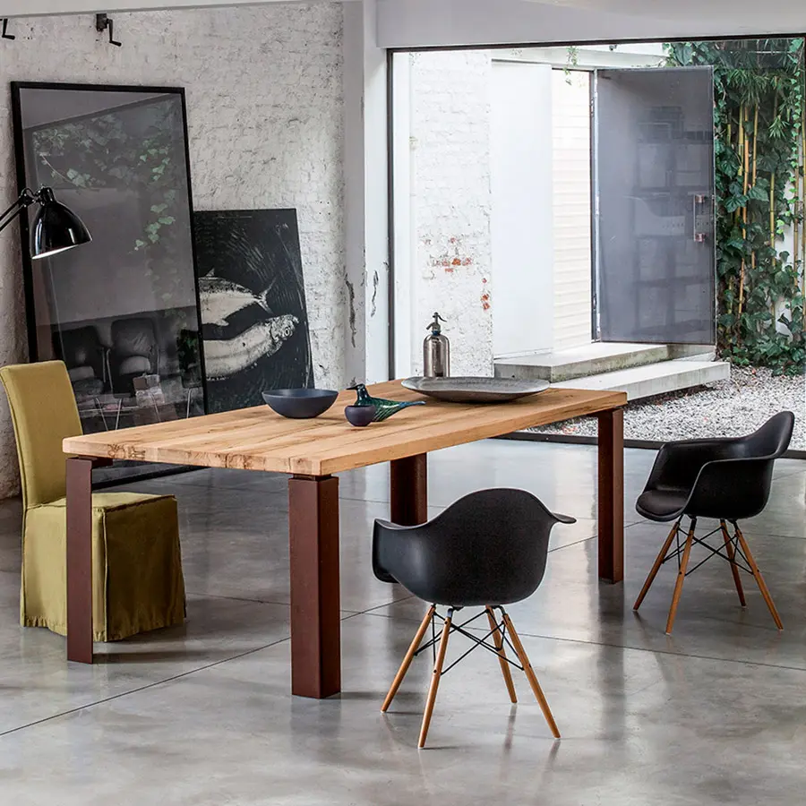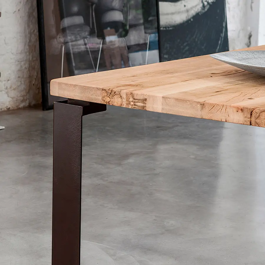 Múltiples soluciones para personalizar aún más la mesa y satisfacer cualquier necesidad. Puedes elegir patas entre las variantes de madera que garantizan la continuidad con la parte superior, el hierro en todos sus acabados, para crear un contraste agradable o el vidrio para aligerar la estructura, consiguiendo que casi desaparezca, con el objetivo de embellecer aún más la nobleza de la encimera de madera maciza.