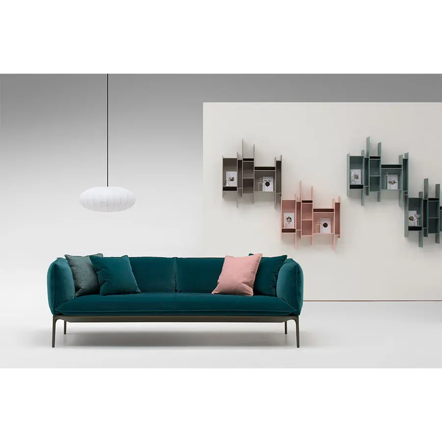 Sillón y sofá con fuerte personalidad y cojines grandes, que proporcionan una comodidad considerable y una gran funcionalidad. Disponible en dos profundidades de asiento diferentes y en dos alturas de respaldo diferentes, lo que garantiza una posición cómoda para sentarse y una fuerte adaptación a las necesidades y requisitos del momento. Marco de aluminio compuesto con bandas elásticas, pies de aluminio fundido a presión. El marco está pintado de blanco mate, gris piedra y gris antracita.