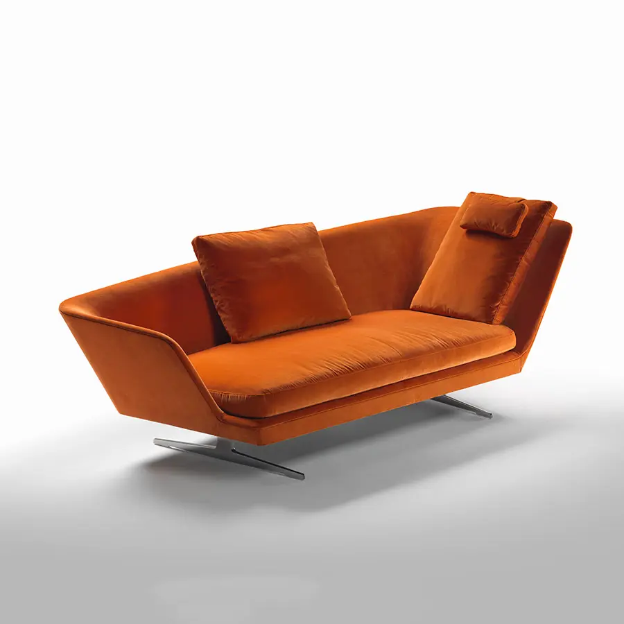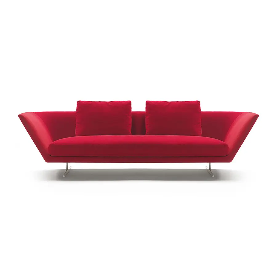 Zeus es un sofá con una personalidad inconfundible y definitivamente está destinado a desempeñar un papel de protagonista en cualquier espacio, doméstico u hostelero, al que Zeus confiere un estilo original y una nota decorativa moderna y sofisticada. El sofá Zeus está disponible en un único tamaño y tiene una carcasa rígida hecha de poliuretano estructural y poliuretano expandido, que exhibe una línea dinámica que permite que los reposabrazos se ensanchen desde la base. Dentro de la estructura están alojados el suave cojín del asiento relleno de pluma de ganso con un inserto no deformable y los cojines del respaldo en su parte baja, diseñados para que el respaldo sea más cómodo. El sofá se mantiene levantado del suelo gracias a una refinada base de metal fundido a presión disponible en los acabados satinado, cromado, bruñido, cromo negro y champán.