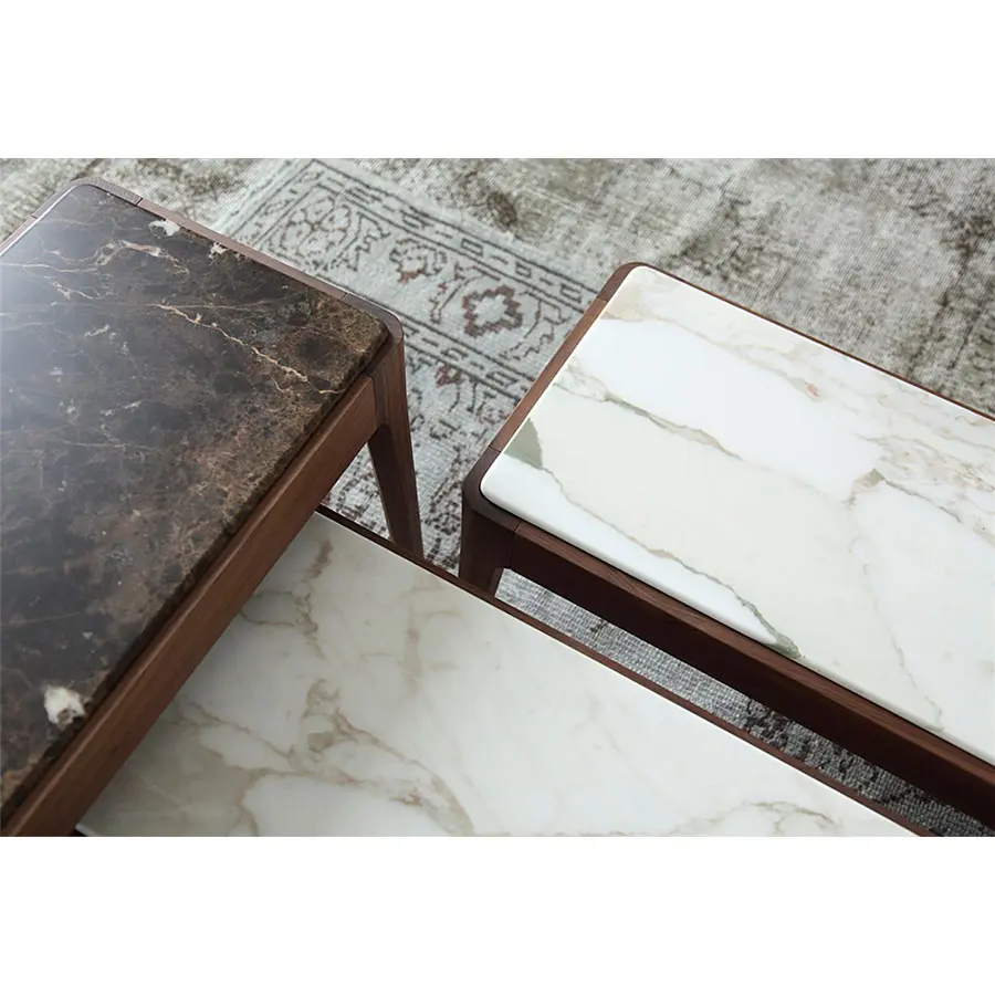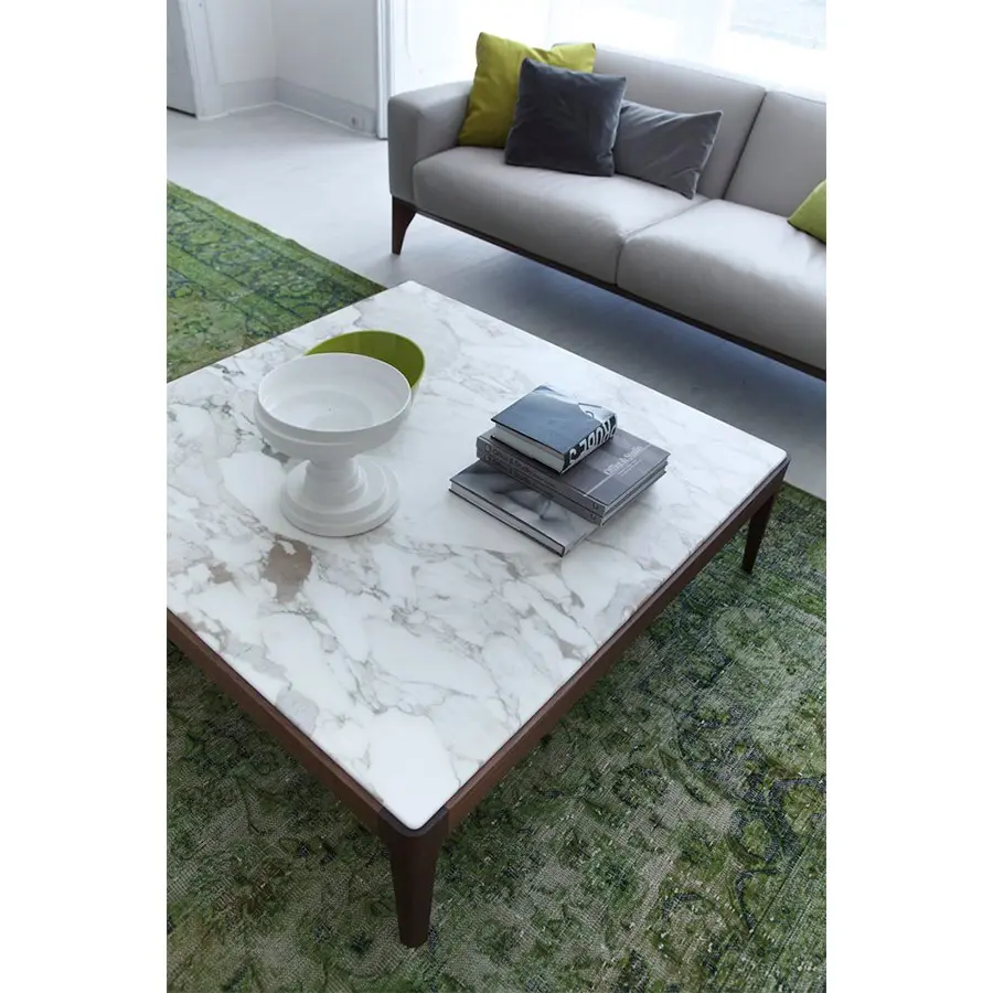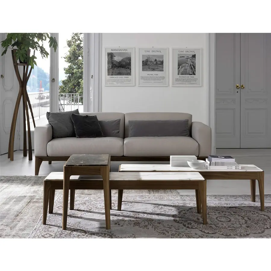 Serie de mesas de centro o auxiliares o de consolas de varias dimensiones. Estructura de nogal canaletta macizo y tapa de madera, de mármol o de cristal retrobarnizado. Ziggy nace desde la simplicidad y perfección, manteniendo el carácter artesanal que tanto caracteriza a Porada. Disponible en una amplísima variedad de medidas y acabados, se adapta a todos los ambientes.